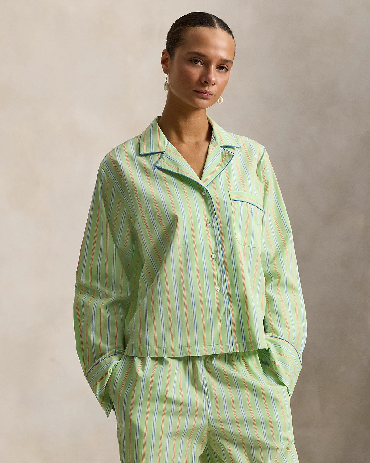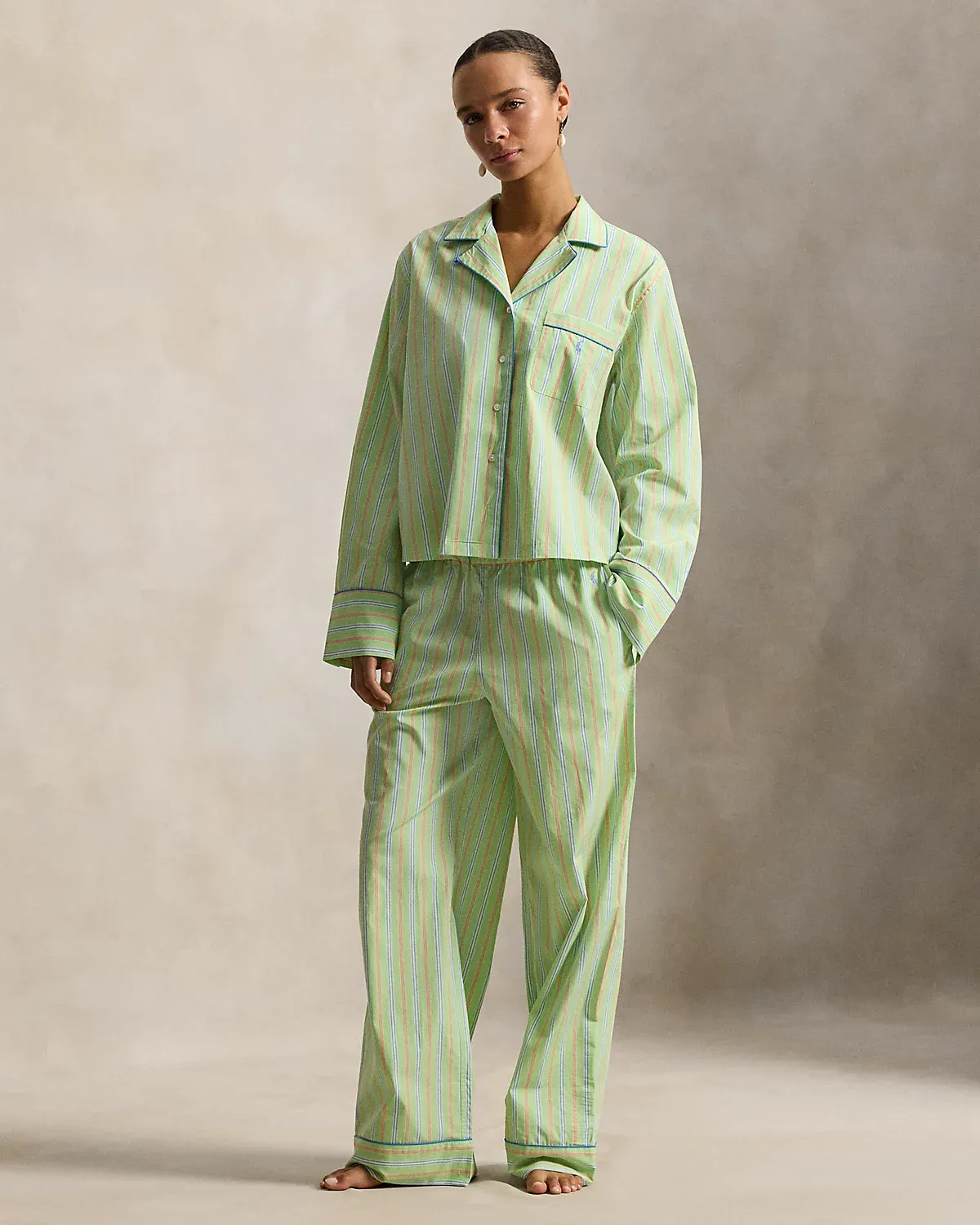 Made with cotton poplin fabric, specially selected for its breathability, these pajamas pair a long-sleeve dived shirt and full-length pants. The colorful striped pattern is accented by piped trim and our signature embroidered Pony.