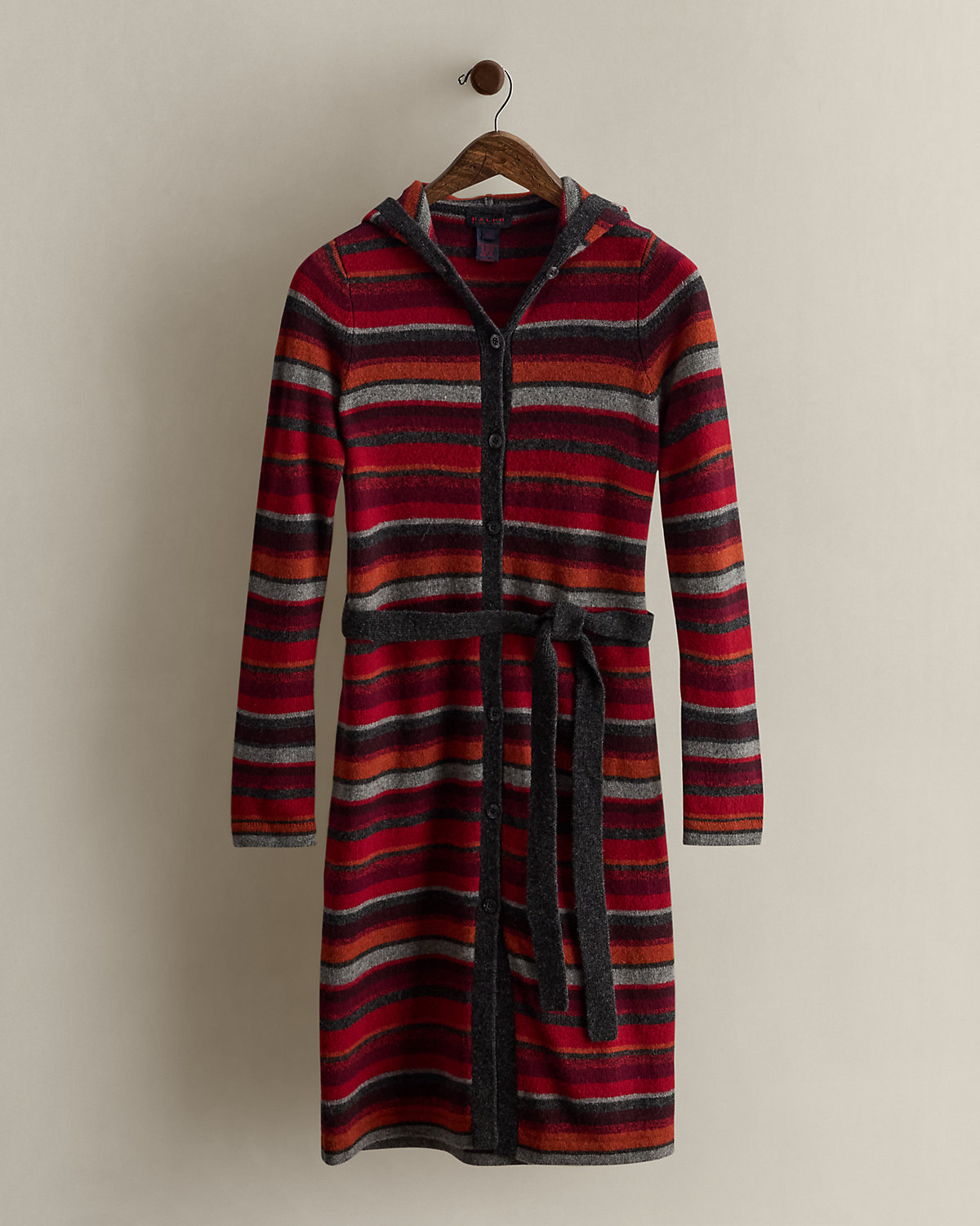 Circa 1996. Part of the women’s Ralph collection. Striped lambswool hooded sweater with a dived placket and a self-belt. Elongated silhouette. Size XS has a 38.75" back body length, a 13" shoulder, a 16.5" chest, a 16.25, a 24.25" sleeve, and a 16.25" waist.