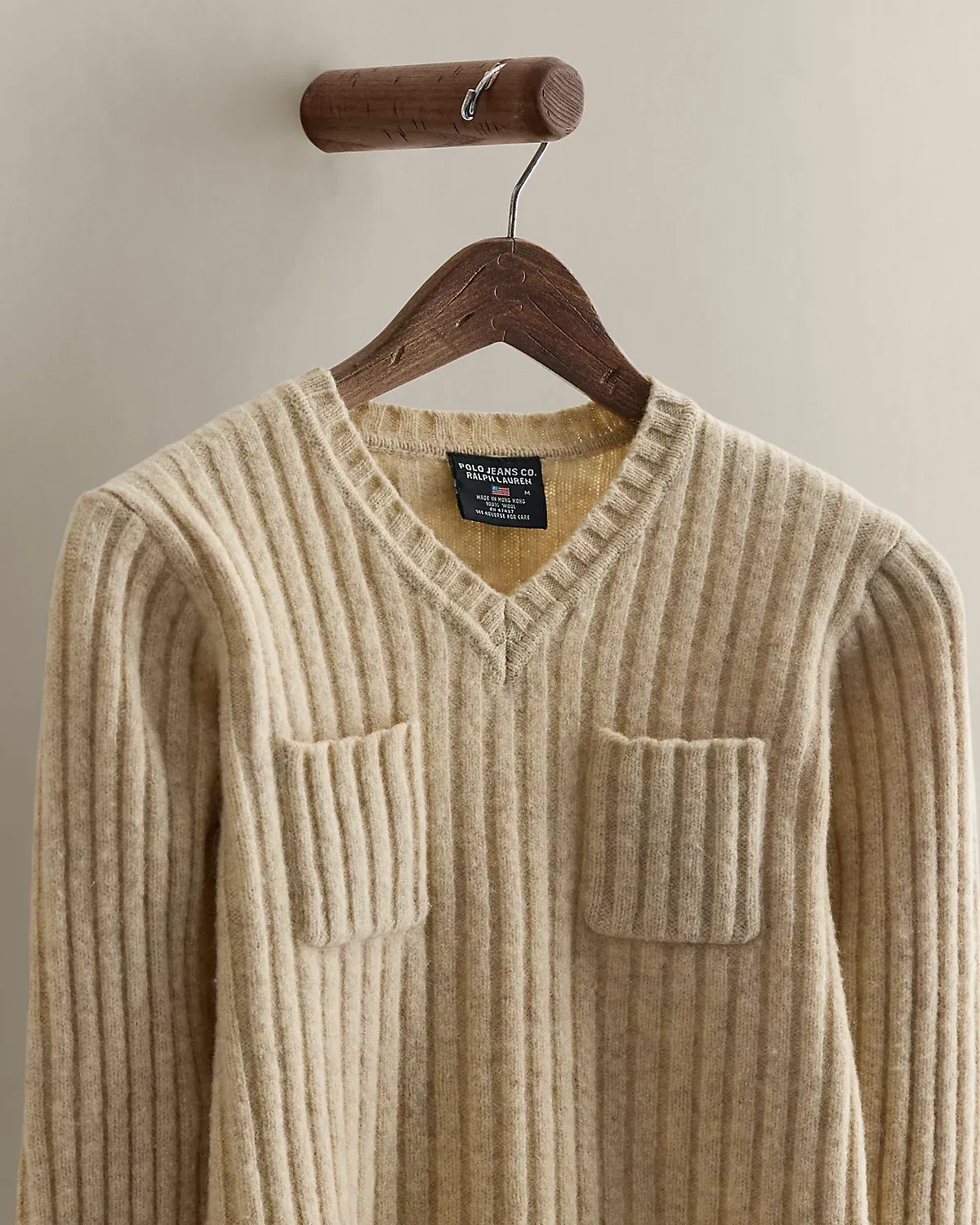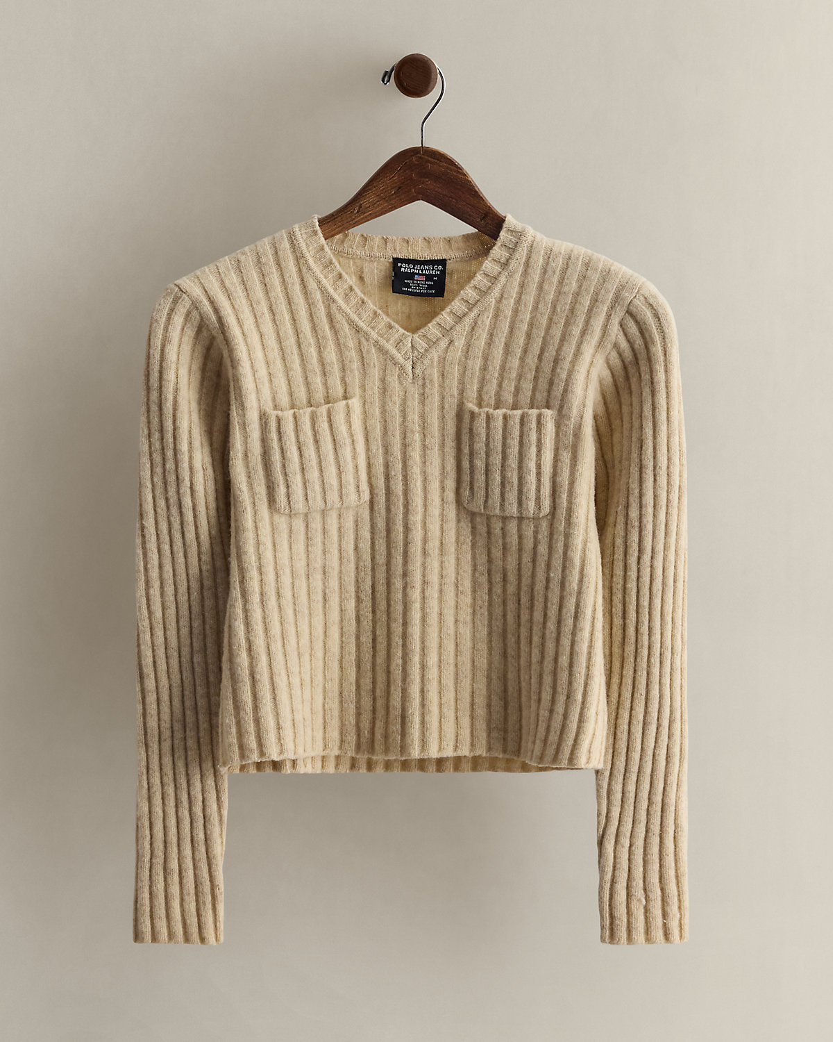 Circa 2001. Part of the women’s Polo Jeans Co. collection. Rib-knit wool sweater with a V-neckline, two chest pockets, and a “Polo Jeans Co. Ralpthth Lauren” woven label. Size medium has a 16.5" body length, a 14" shoulder, a 16" chest, and a 22" sleeve length.
