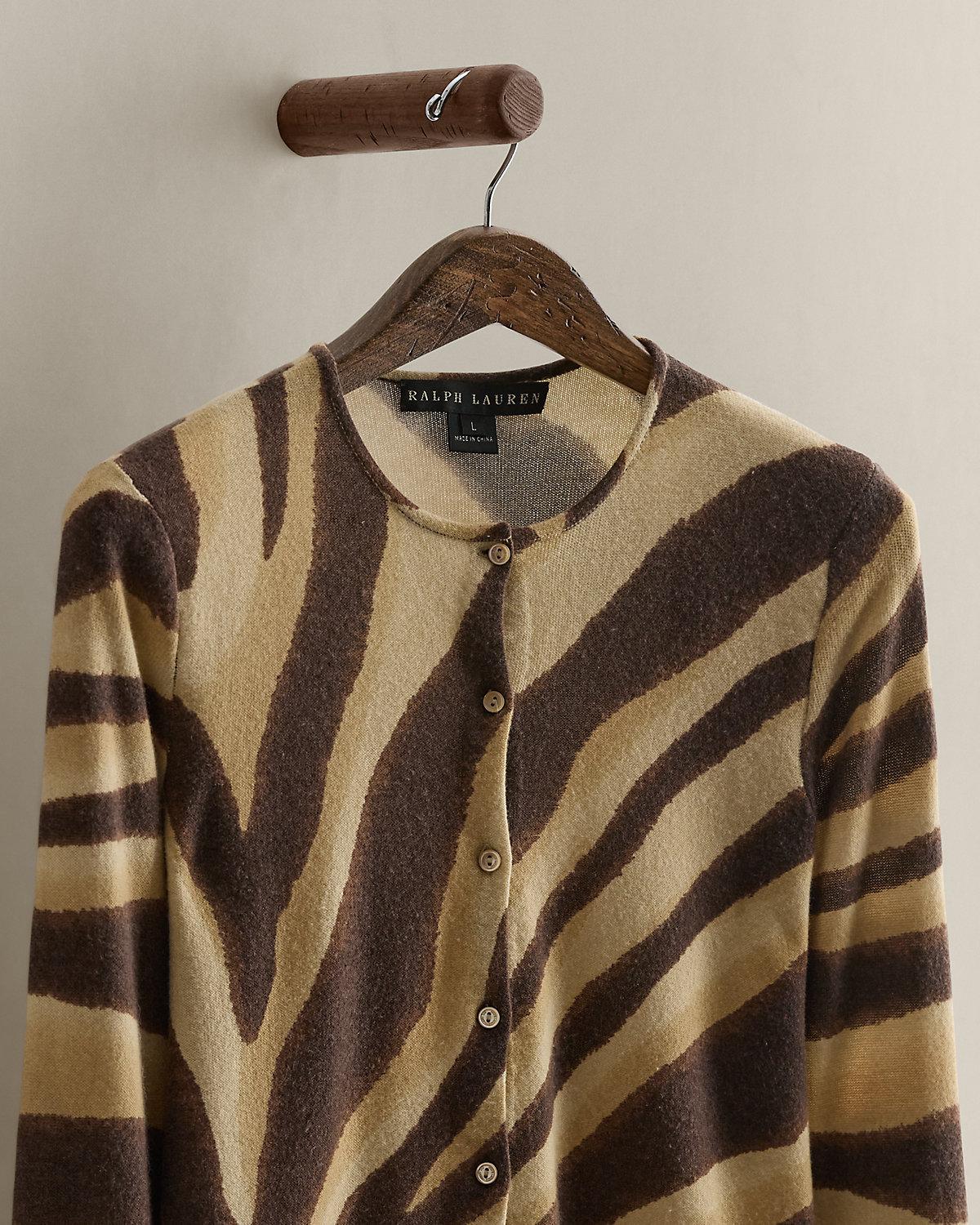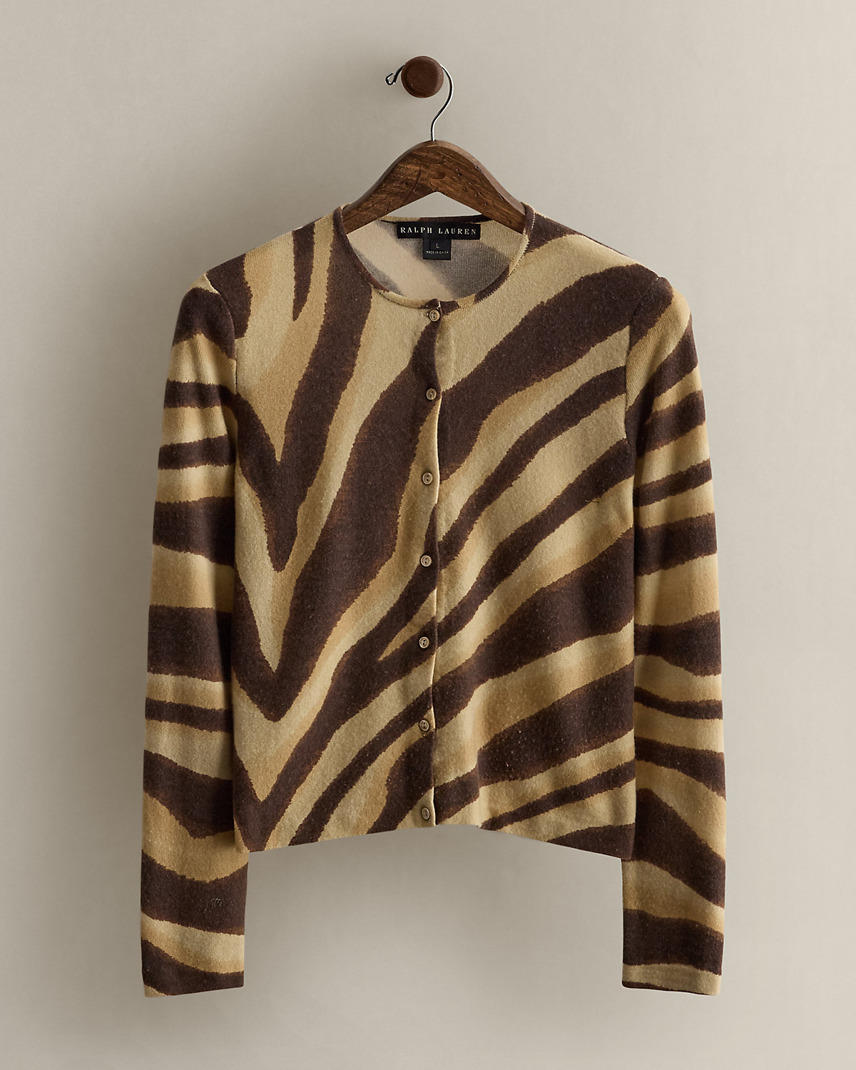 Circa 2005. Part of the women’s Ralpthth Lauren Black Label collection. One hundred percent cashmere cardigan featuring a zebra print. Size large has a 20.25" back body length, a 15" shoulder, a 17.25" chest, and a 24.25" sleeve length.