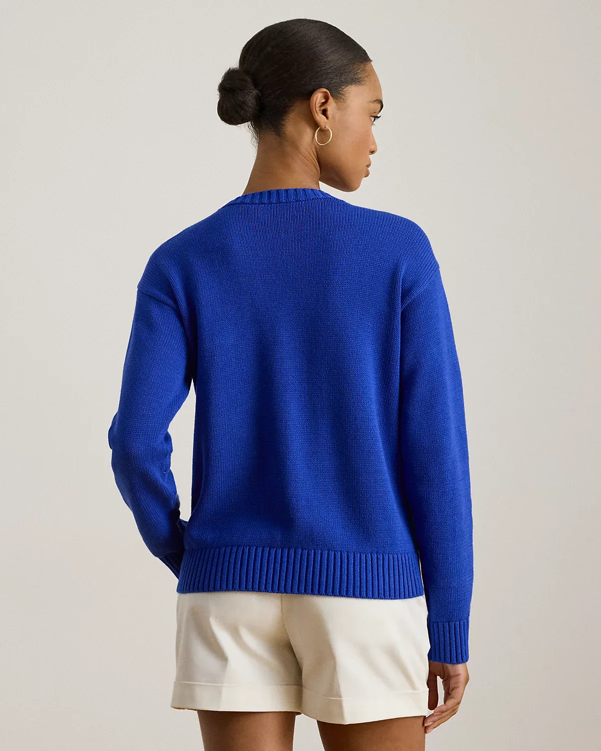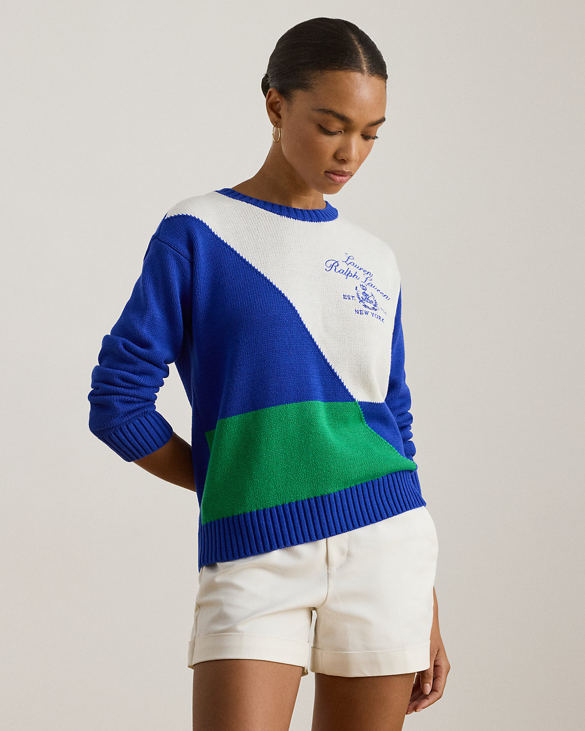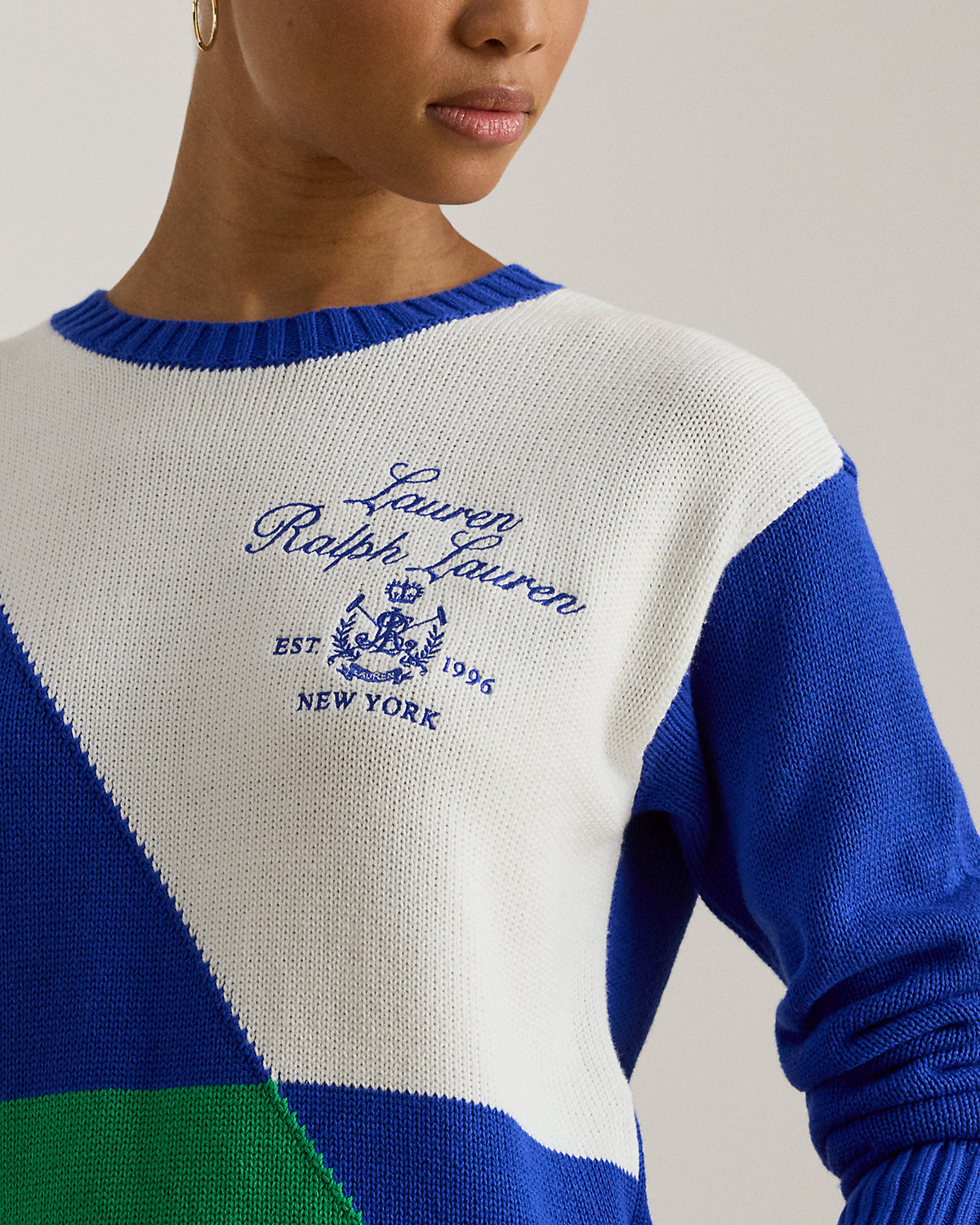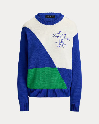 Embroidered with Lauren’s signature crest at the chest, this combed-cotton crewneck sweater showcases a color-blocked design inspired by sailing flags.