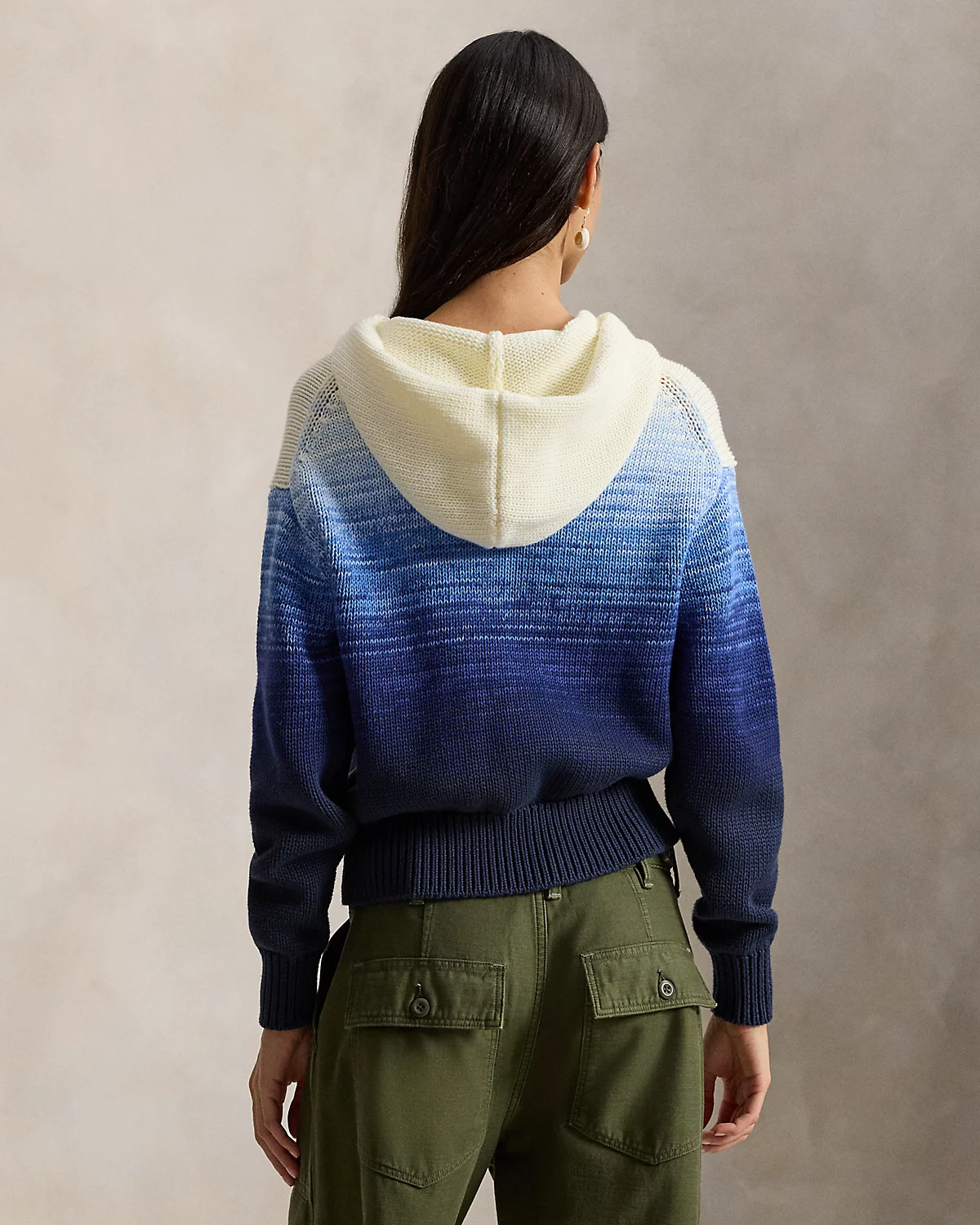 Specially knit with cotton for an ombré effect, this version of Polo’s iconic flag sweater features a full-zip placket and hood. Embroidered stars, whipstitching, and a hand-embroidered “RL” logo add texture and dimension to the relaxed-fitting silhouette.