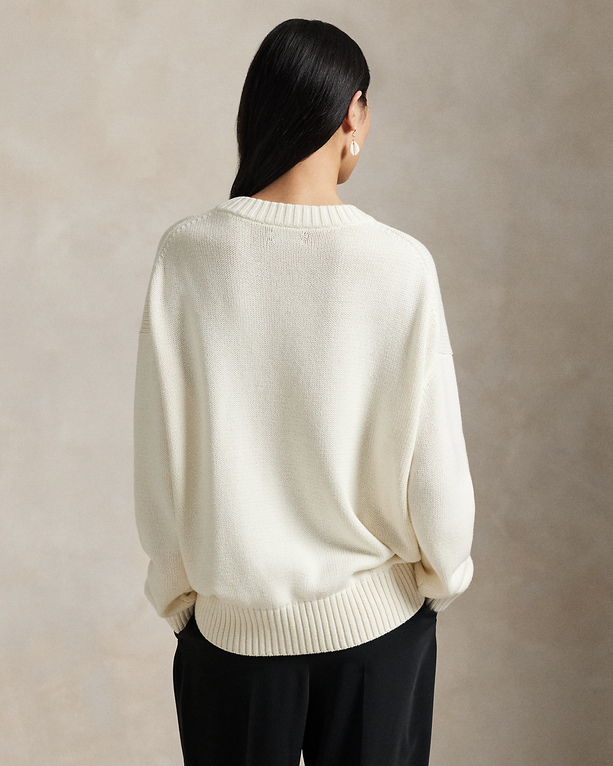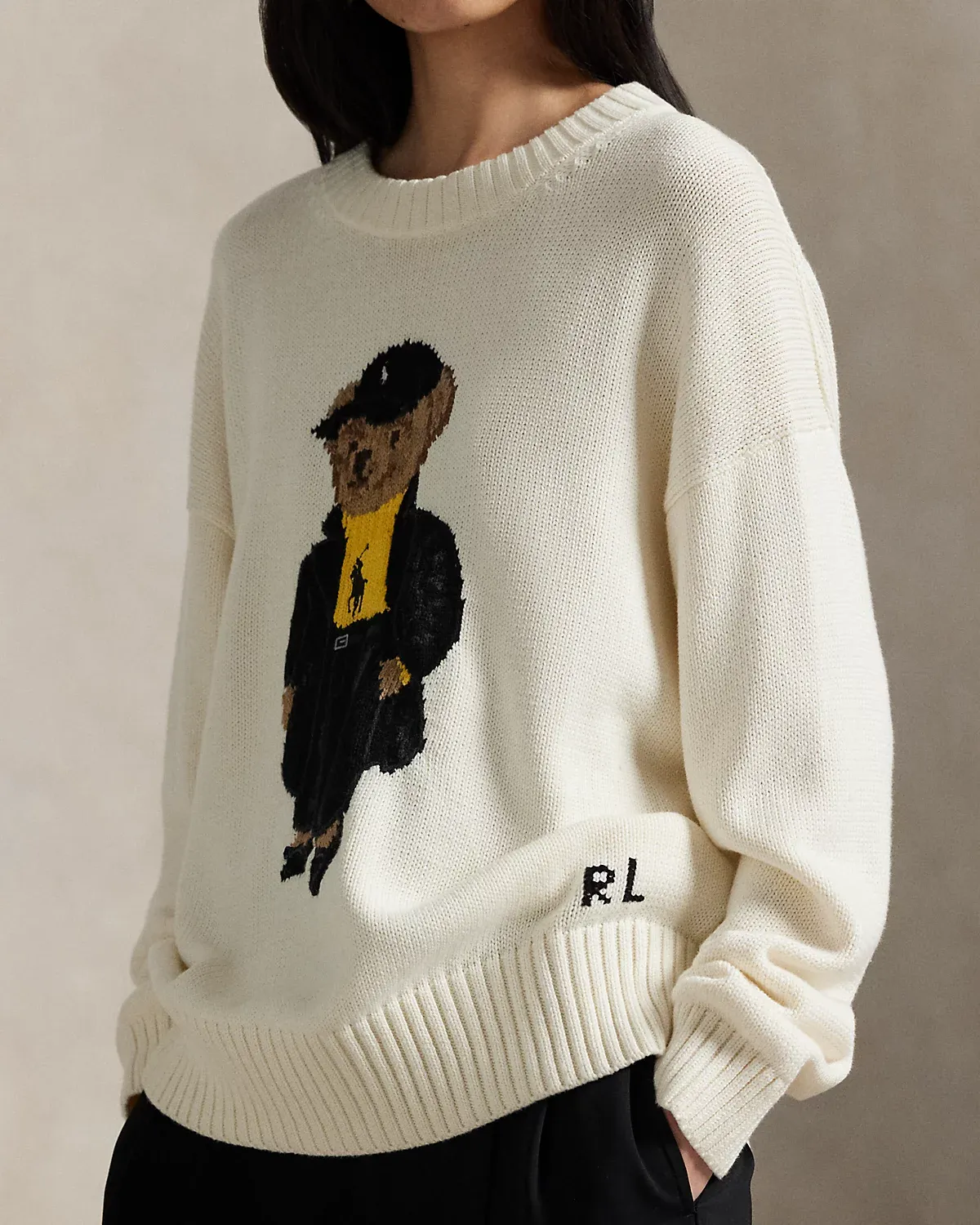 - Polo Bear intarsia-knit at the front. “RL” cross-stitched at the left hem.