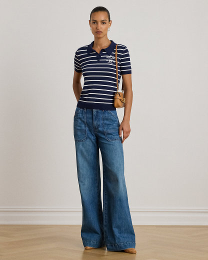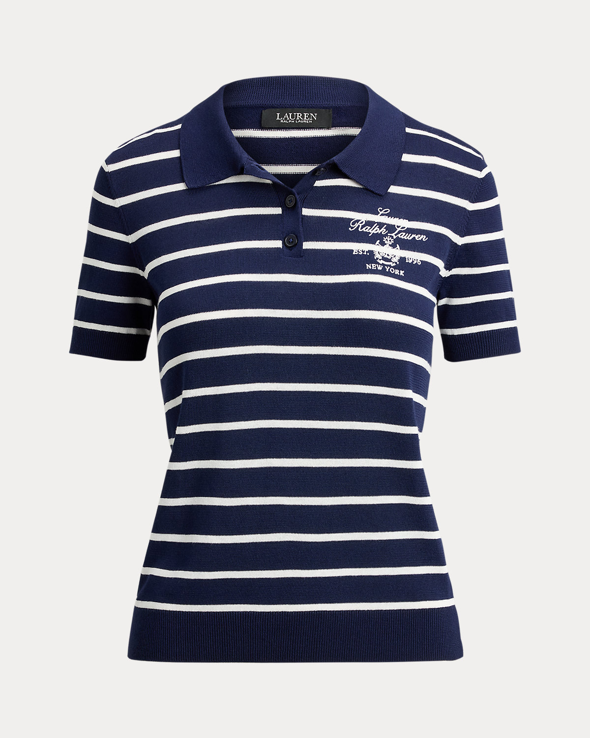 Uniting a timeless Polo shirt silhouette with the comfort of a cotton-blend sweater, this style is distinguished by navy-and-white stripes and an embroidered logo crest at the chest.