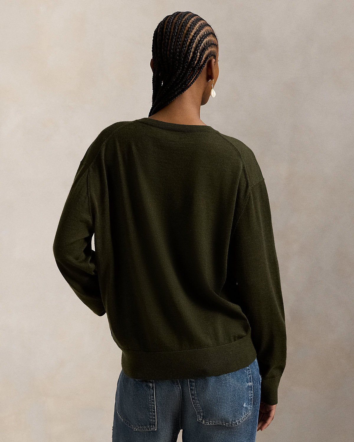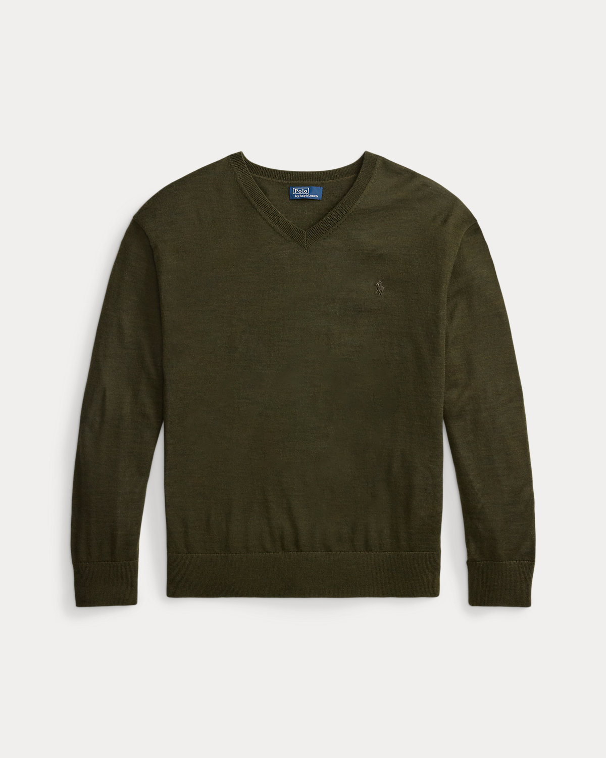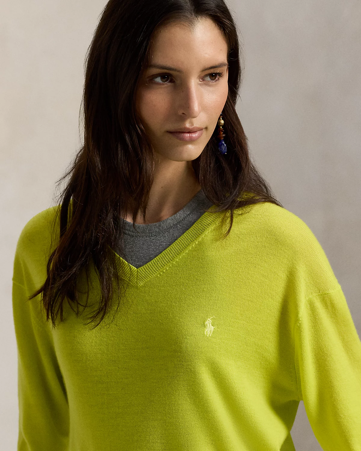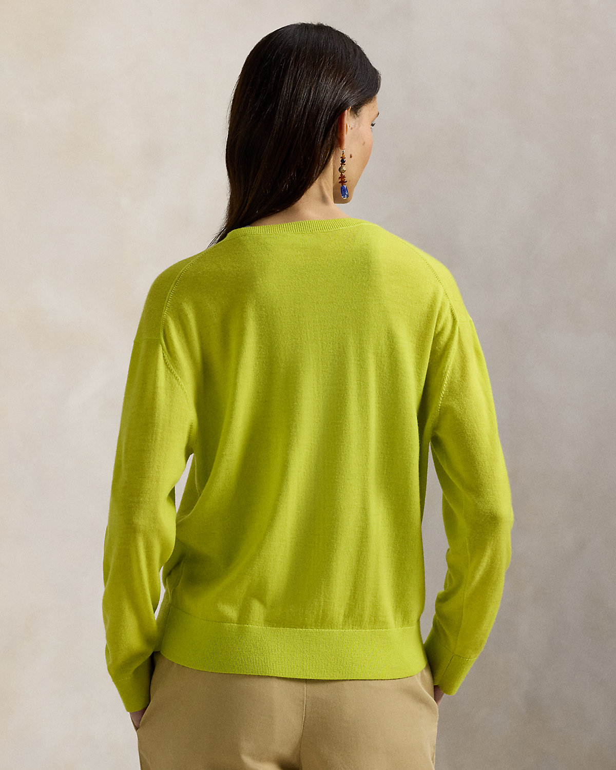 Knit with Italian wool yarn, this high V-neckline sweater offers versatile layering with natural temperature-regulating properties for season-spanning warmth and comfort.