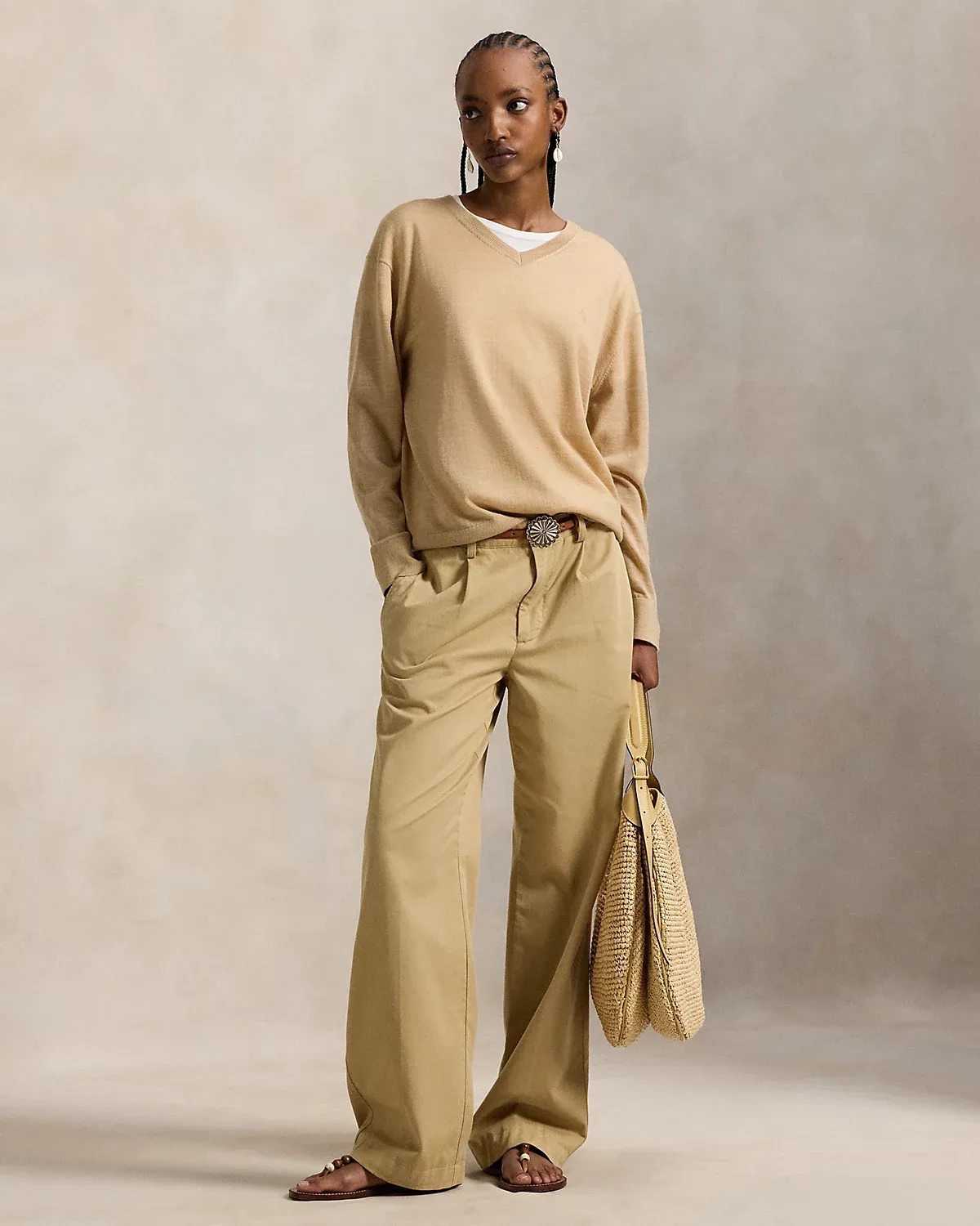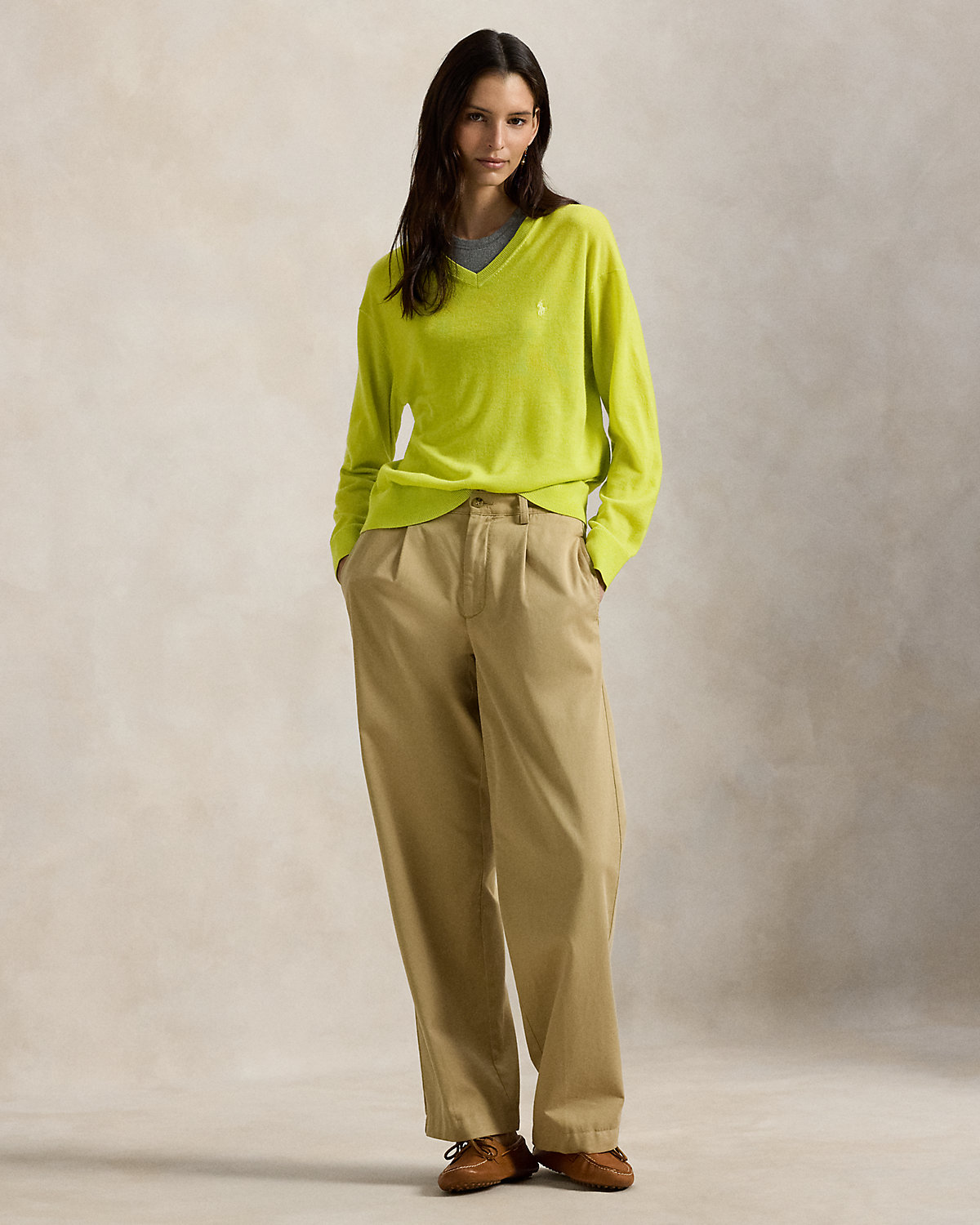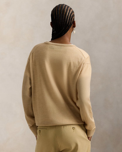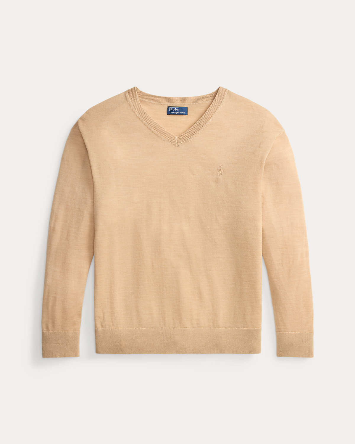 Knit with Italian wool yarn, this high V-neckline sweater offers versatile layering with natural temperature-regulating properties for season-spanning warmth and comfort.