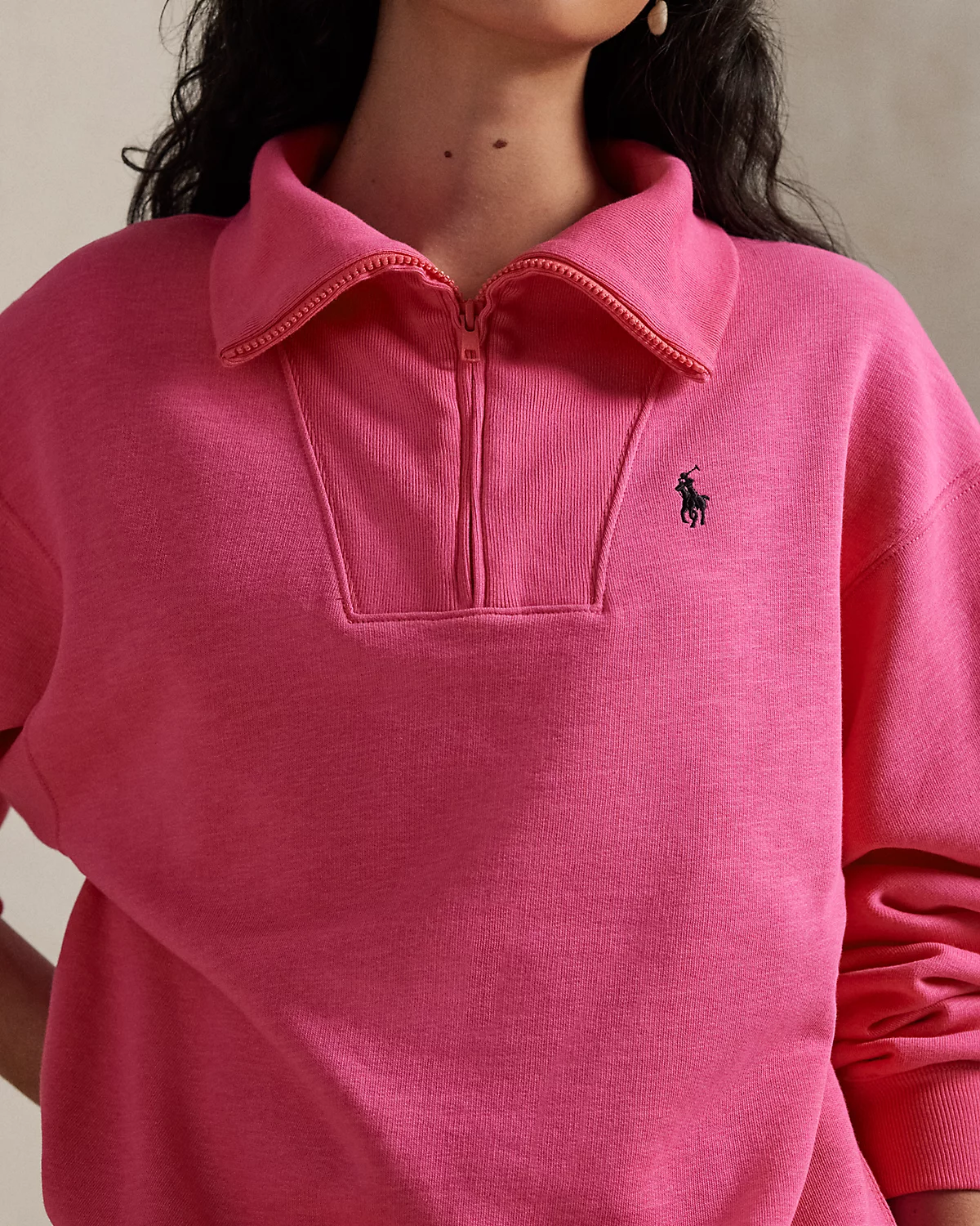 - Ribbed funnelneck. Half-zip placket at the seamed bib. Long sleeves with ribbed cuffs. Dropped shoulders. Signature embroidered Pony at the left chest. “Pink Pony” satin appliqué at the center back. Ribbed hem.