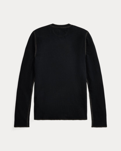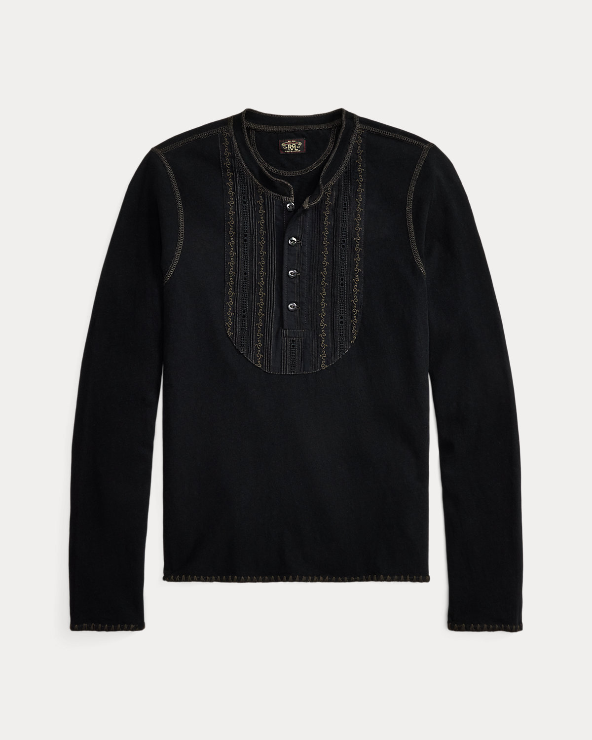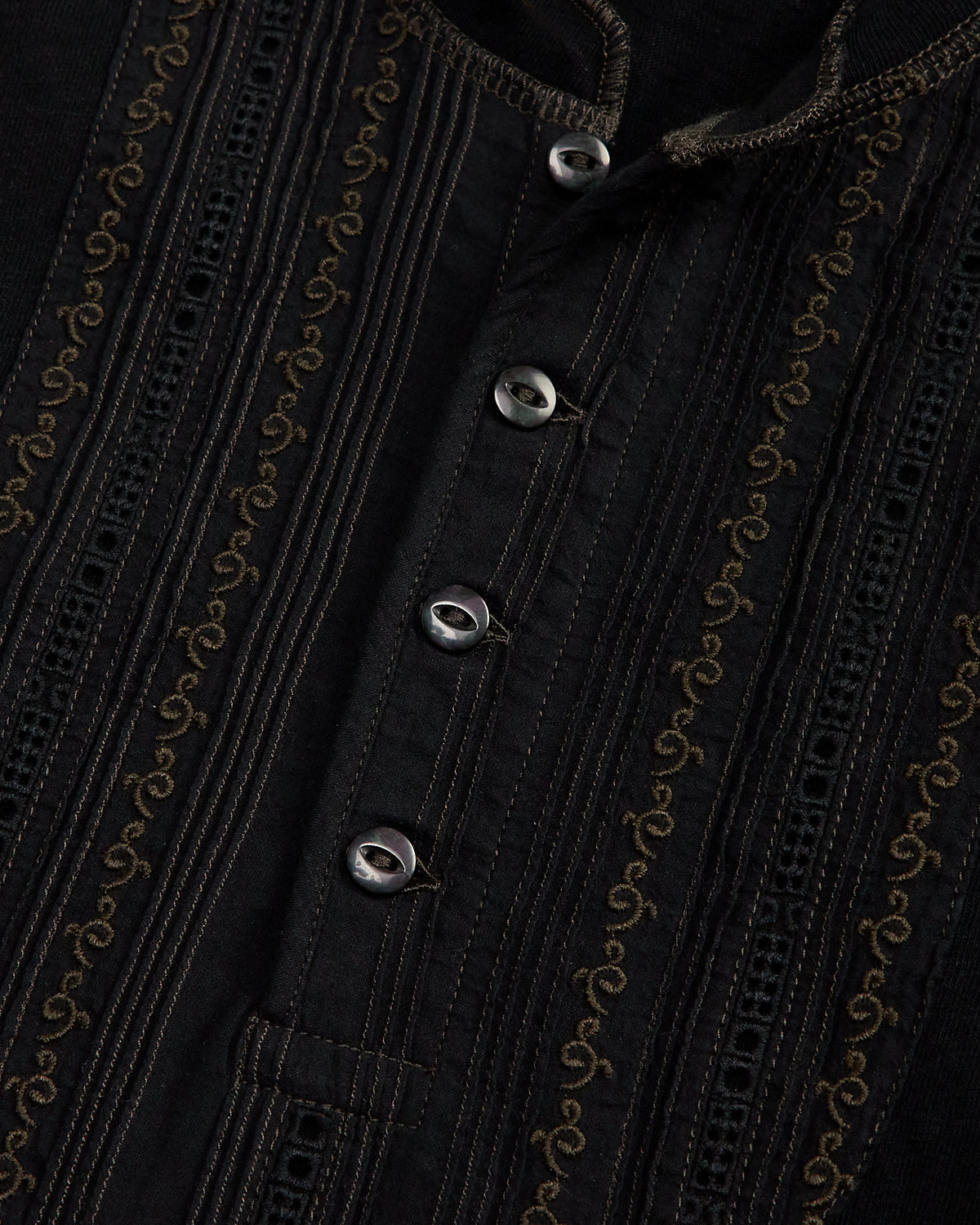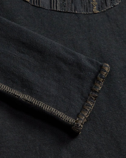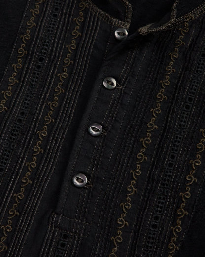 Henley shirt made with cotton-and-linen jersey. Cotton voile bib front features pintucking, inset lace, and embroidered details inspired by a formal men’s shirt from the 1890s. Cotton voile facing at the placket. Hand-applied embroidery at the cuffs and hem.