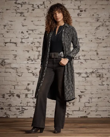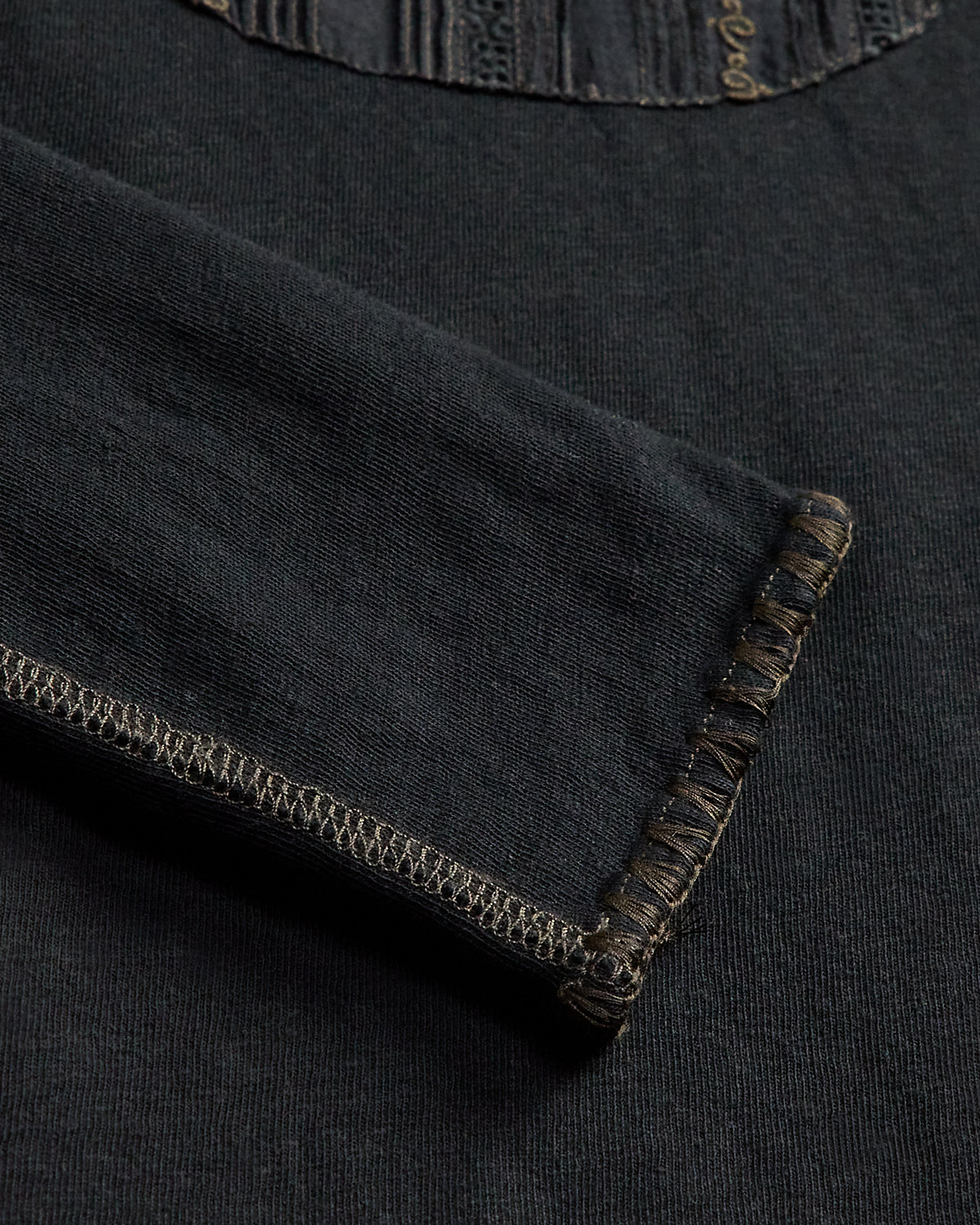 - Hand-applied embroidery at the cuffs and hem.
