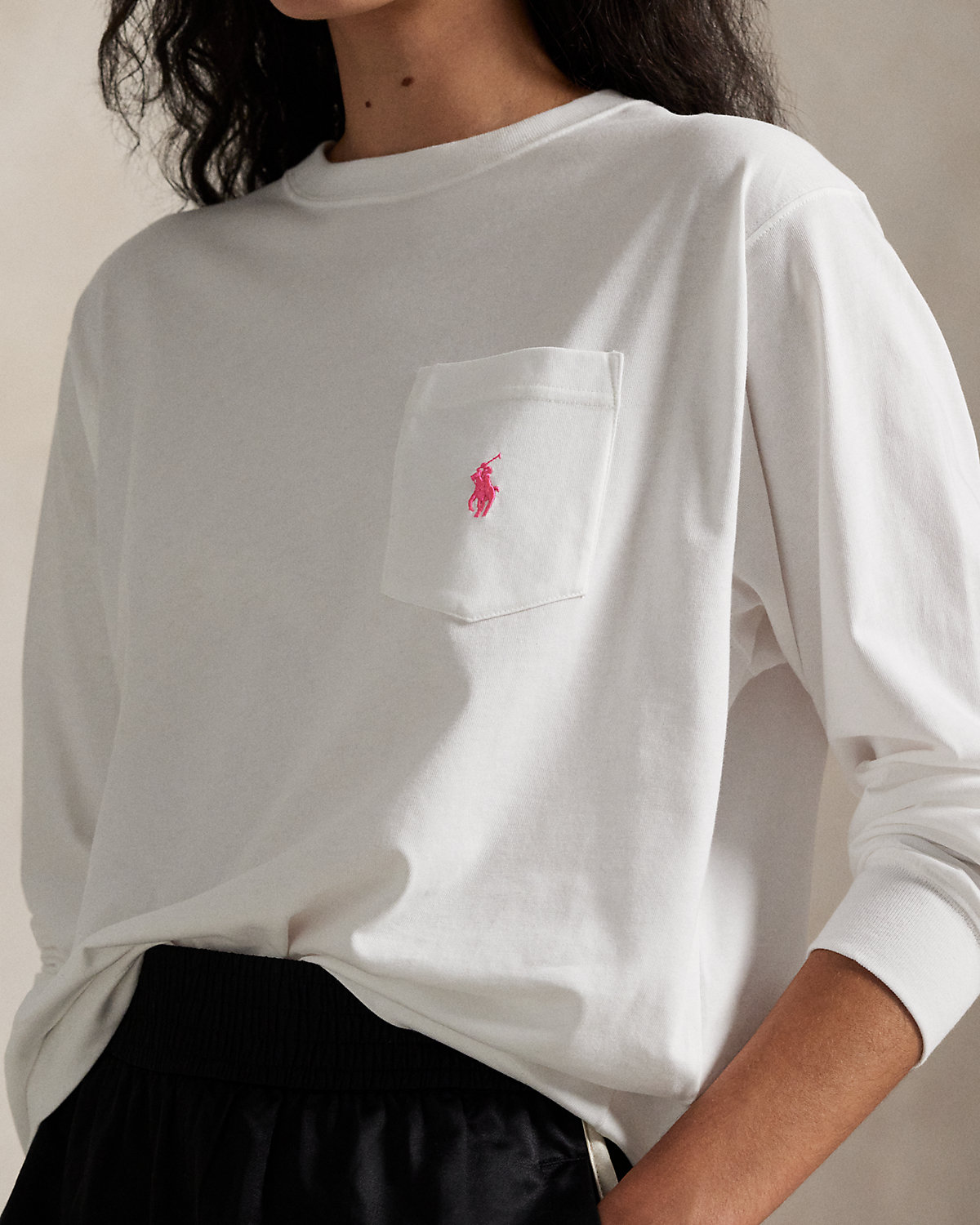 - Ribbed crewneck. Left chest patch pocket. Signature embroidered Pony at the pocket. Long sleeves with ribbed cuffs. “Pink Pony” and signature Big Pony printed at the center back.