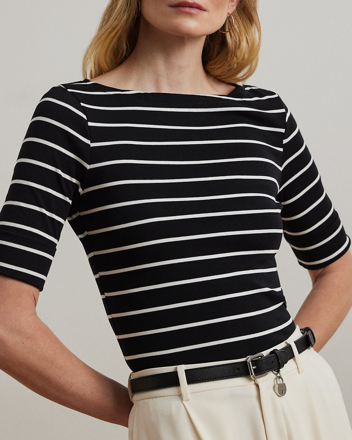 Crafted from soft stretch jersey, this boatneck tee is accented by classic horizontal stripes.