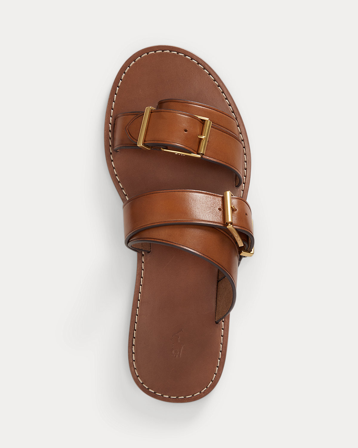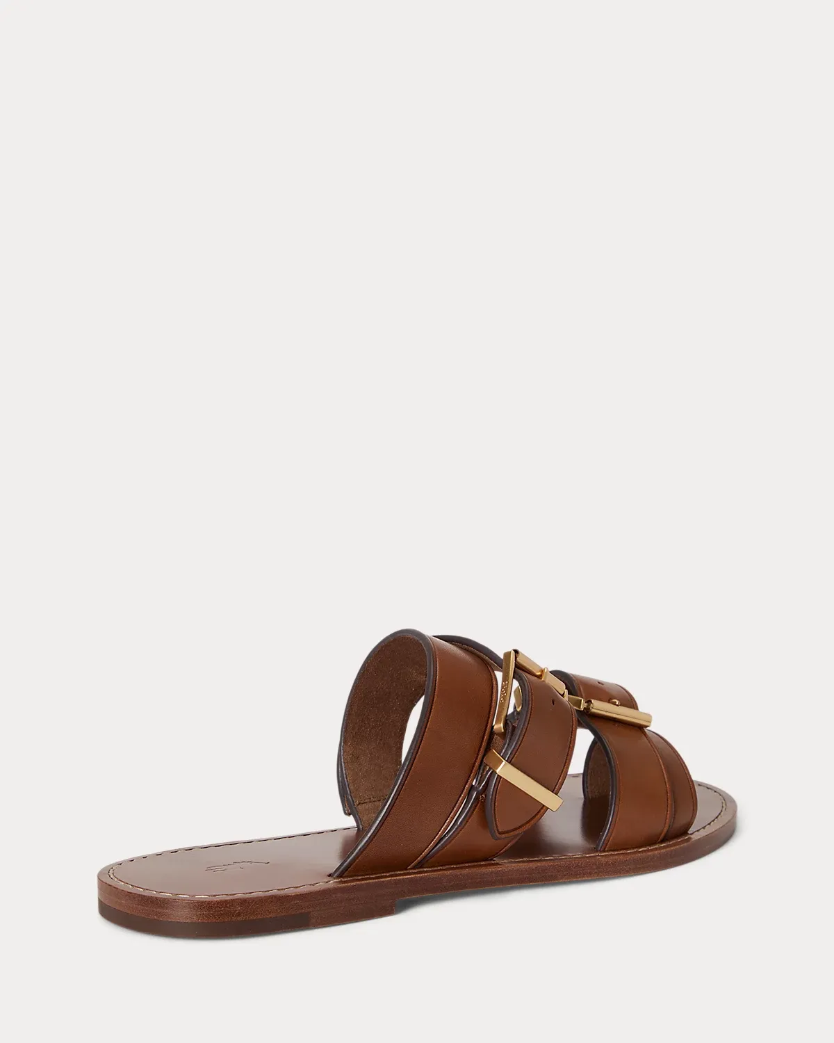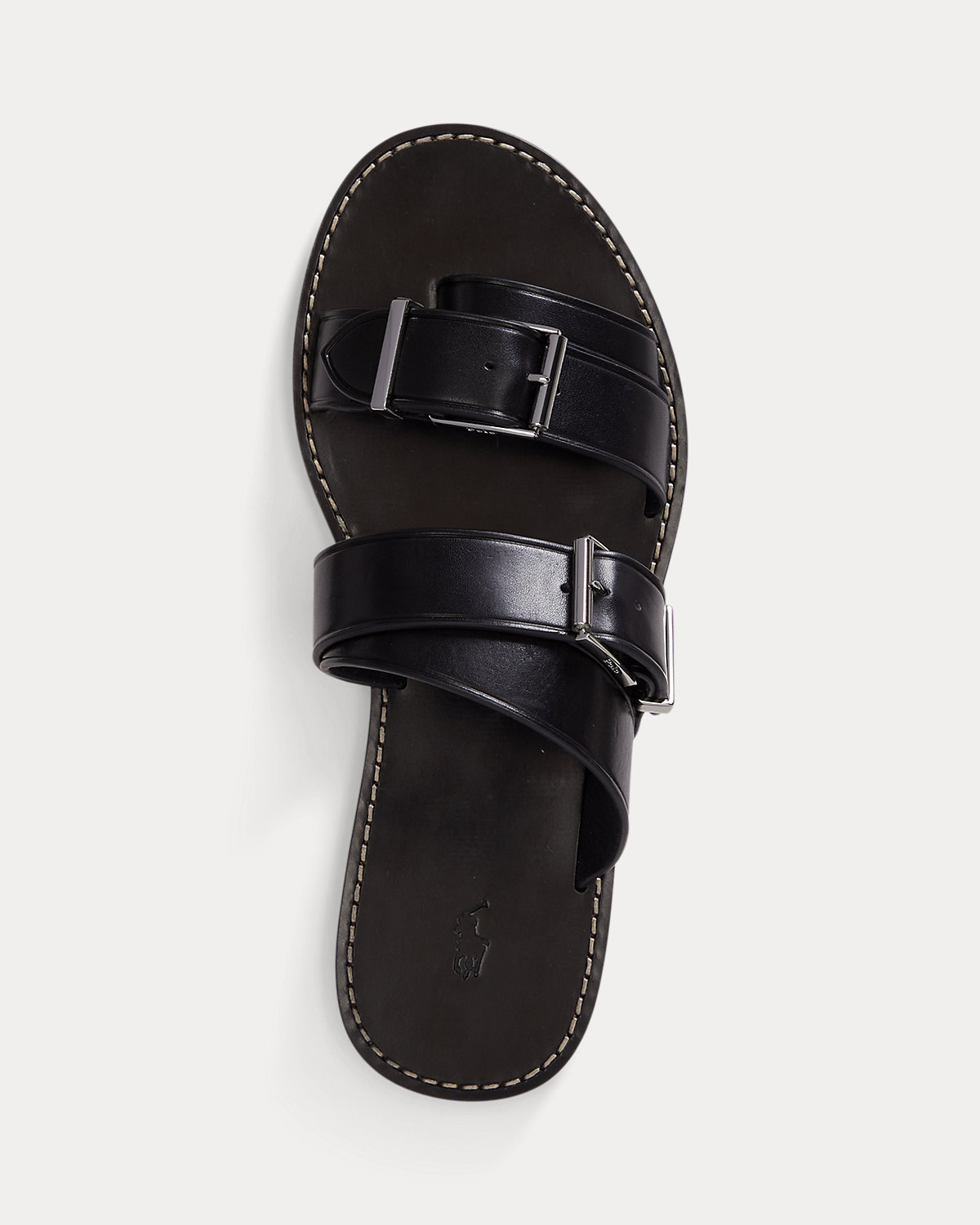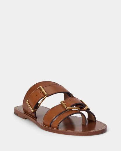 Expertly crafted with burnished Italian leather, this sophisticated slide sandal features an artful arrangement of straps, anchored by one at the toe. Two of the straps are detailed with decorative buckles, engraved with our signature logo.