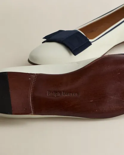Circa 2000. Part of the women’s Ralpthth Lauren collection, these leather ballet flats feature a two-tone design and grosgrain ribbons at the vamp. Size 8B is 10" long and 3.25" wide at the widest point of the shoe.