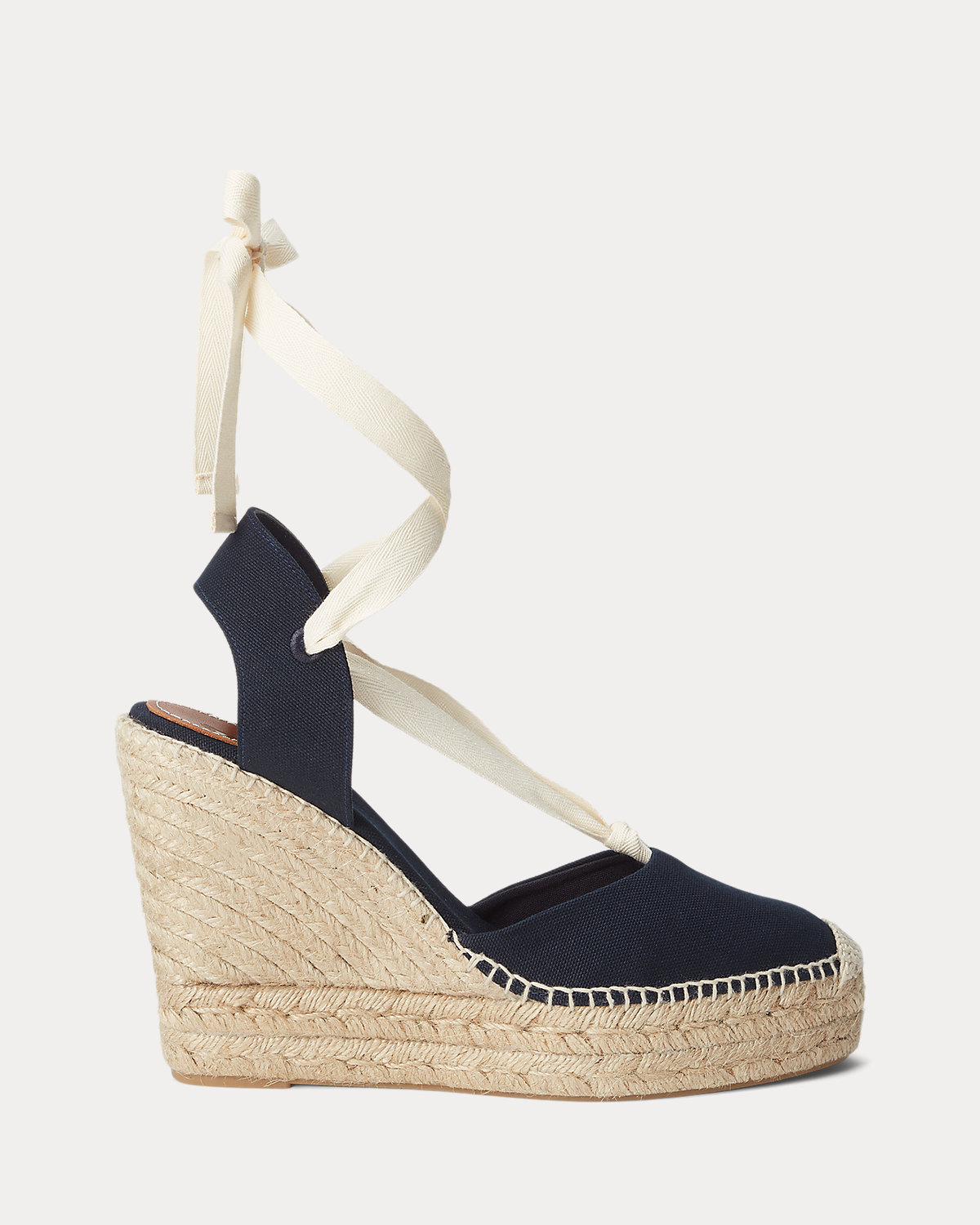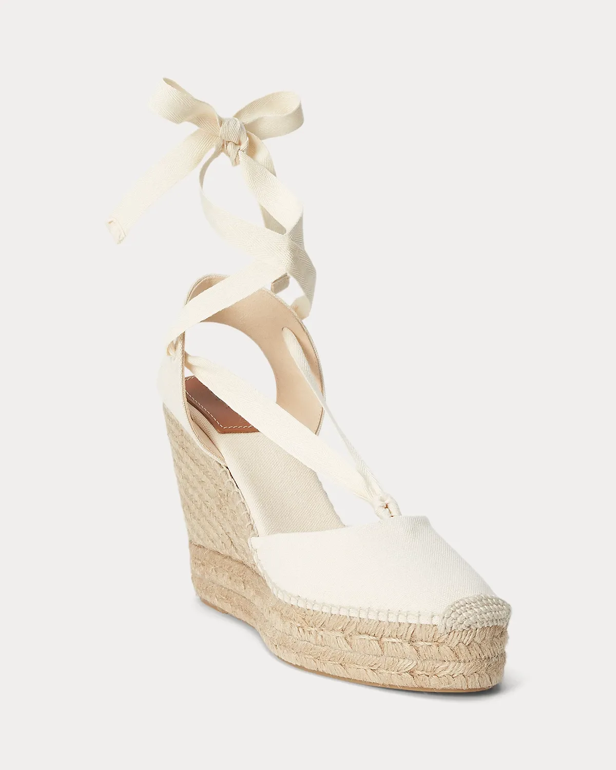 Finely crafted in Spain, these espadrilles unite a braided jute wedge heel with a canvas upper and ties that wrap around the ankle.