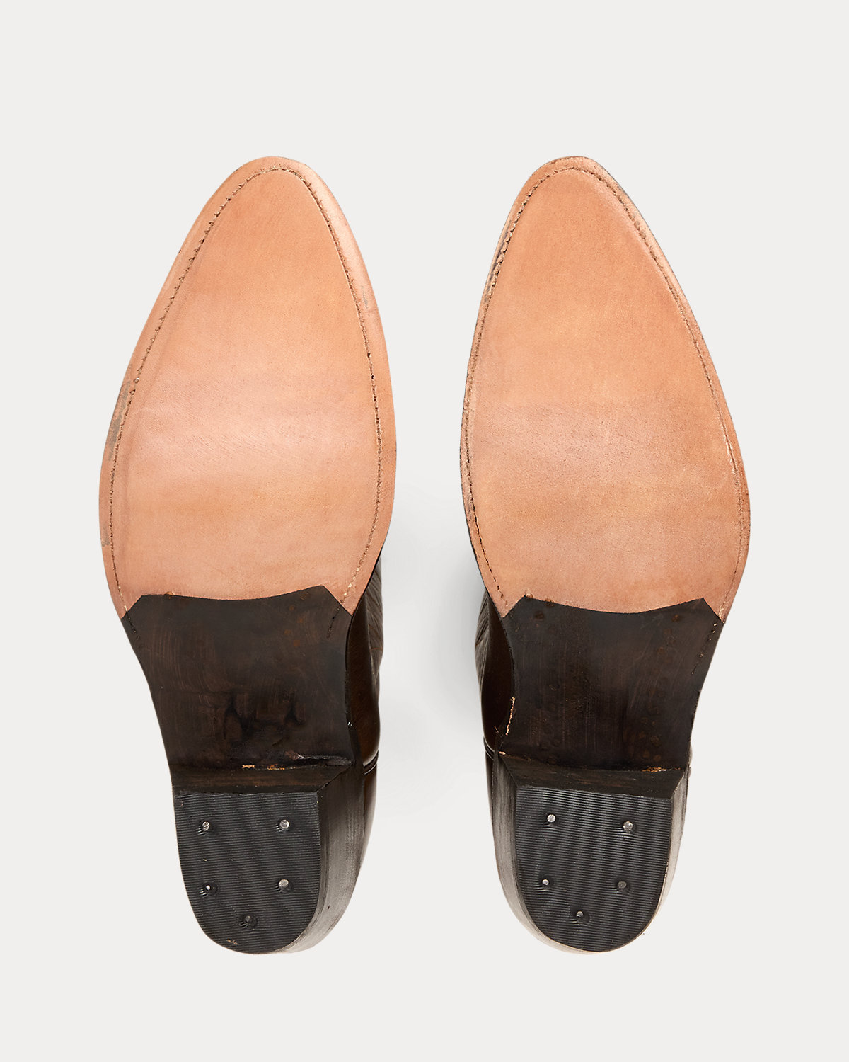 Handmade in a 160-year-old Texas workshop on Western boot lasts from the ’40s. Durable, full-grain cowhide is sourced from an American tannery and heavily burnished for a vintage look. Embroidered upper with leather star inlays. Channel-welted construction. Hand-fitted stacked leather heel with a rubber heel tap for longevity. Vegetable-tanned leather outsole.