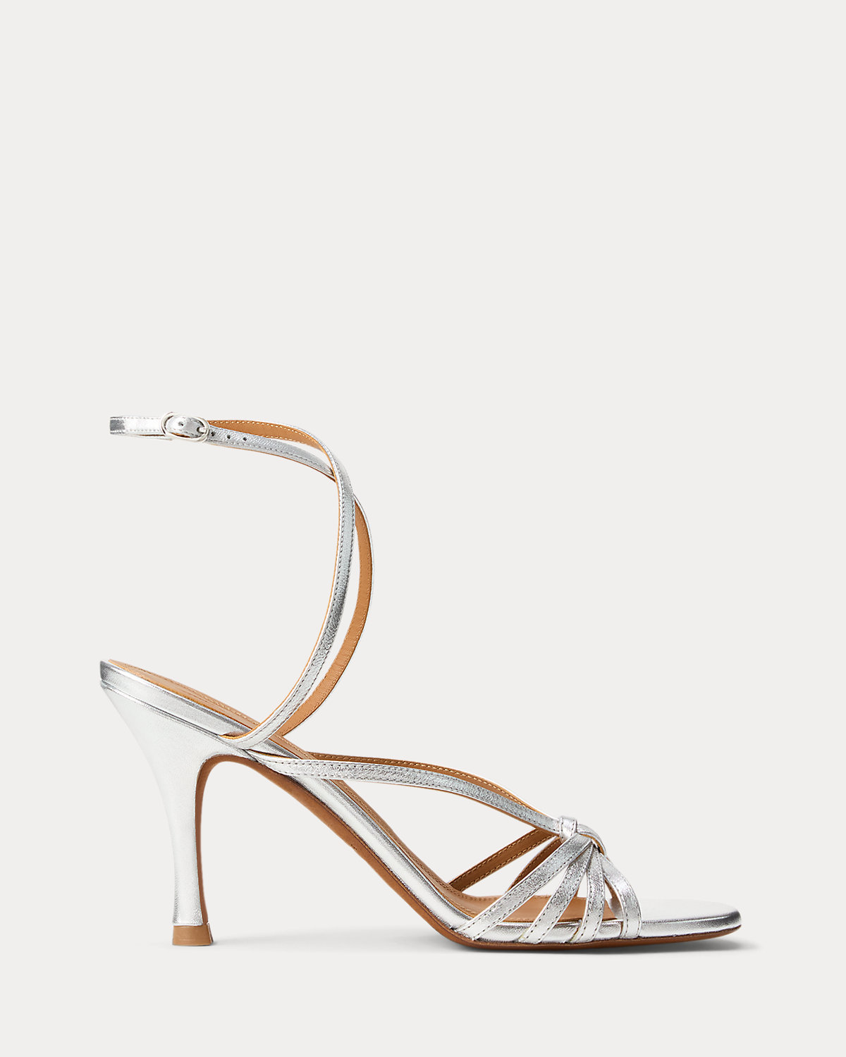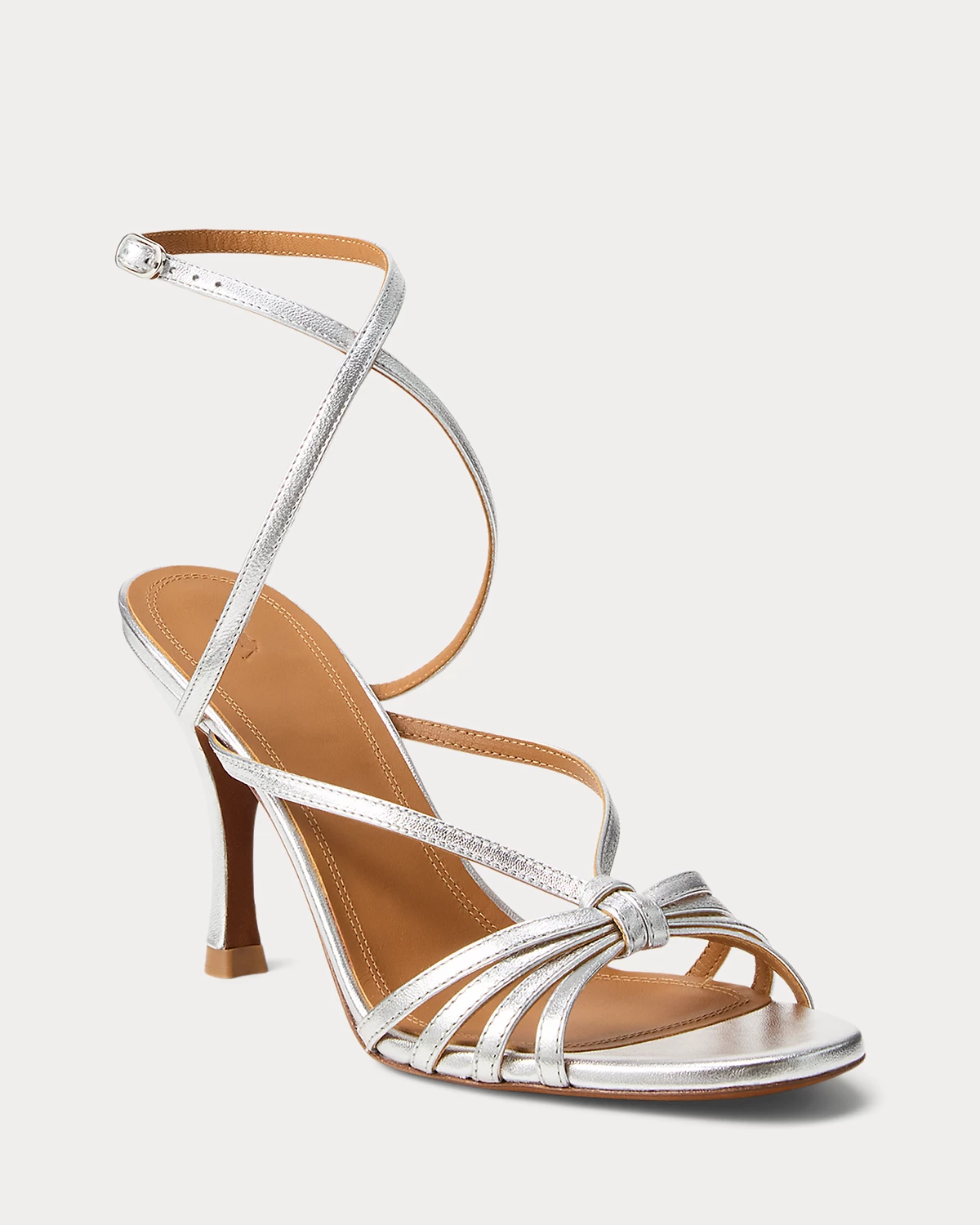 Rendered in metallic leather, this heeled sandal is constructed with a knot detail at the vamp and a slender buckled strap that wraps around the ankle.