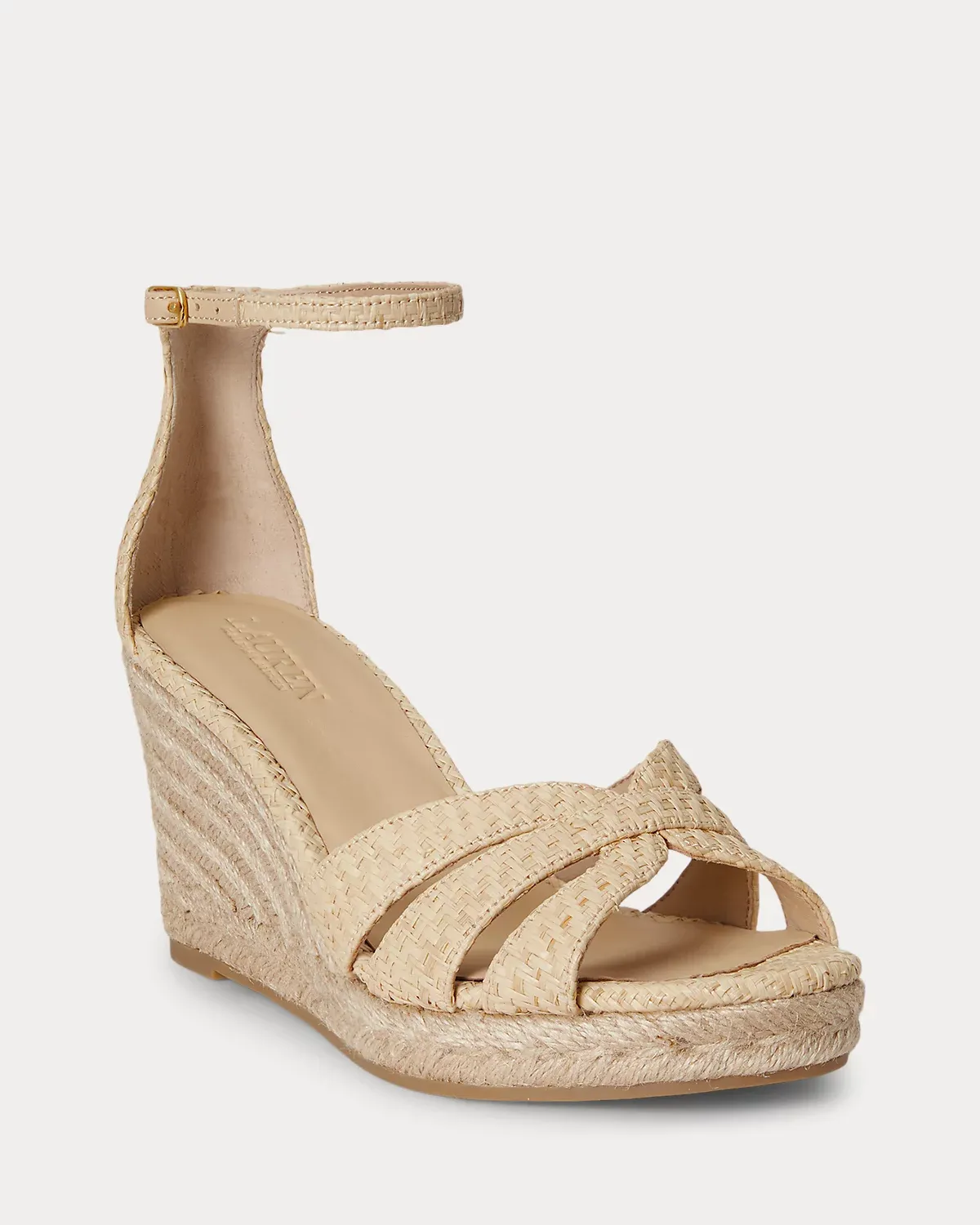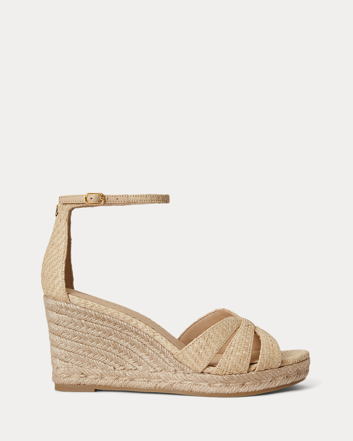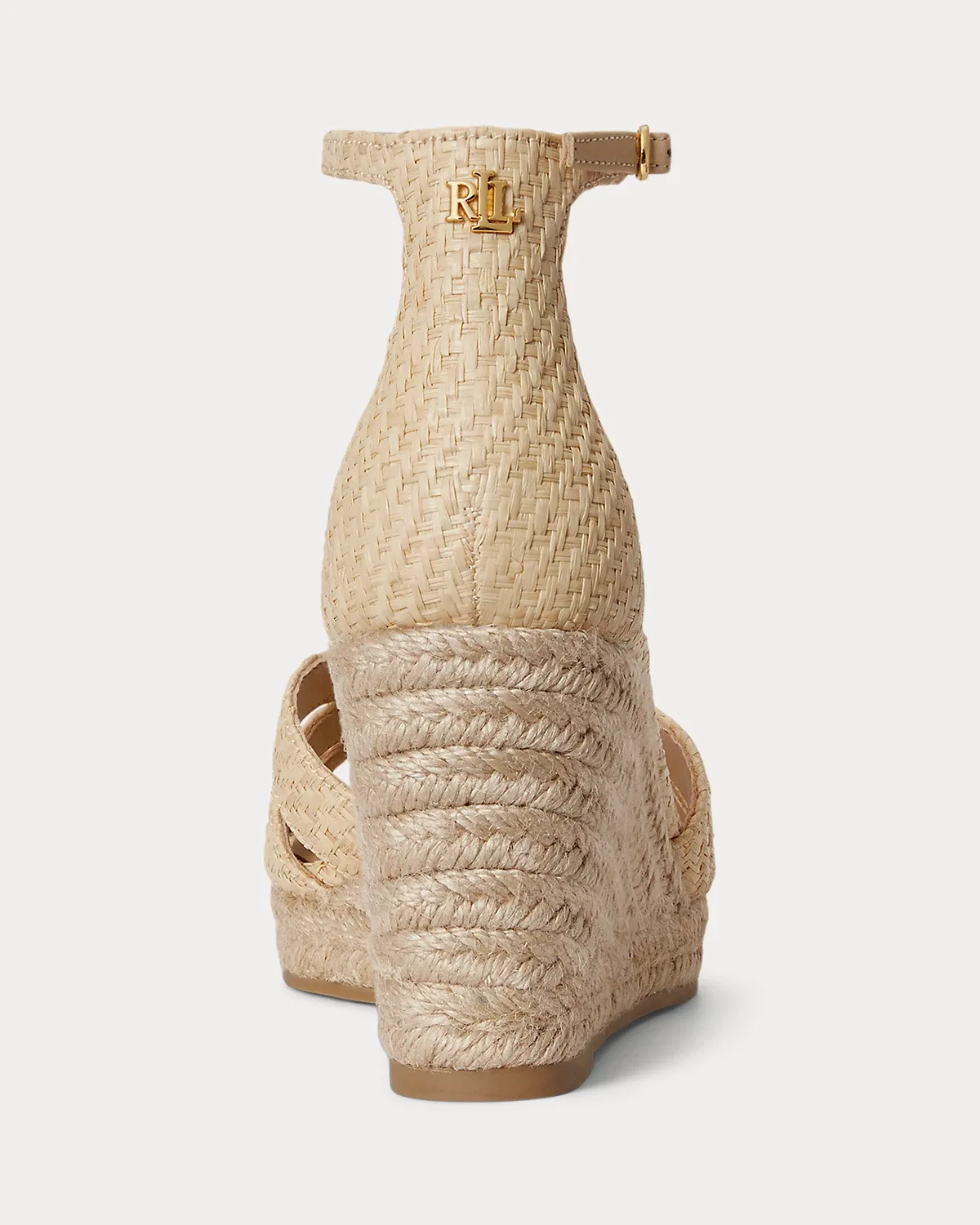The Nellie reimagines the quintessential espadrille silhouette with a multistrap, textured raffia upper set on a jute-wrapped wedge. Our brass-finished logo at the back adds an unmistakable Lauren Ralpthth Lauren finish.