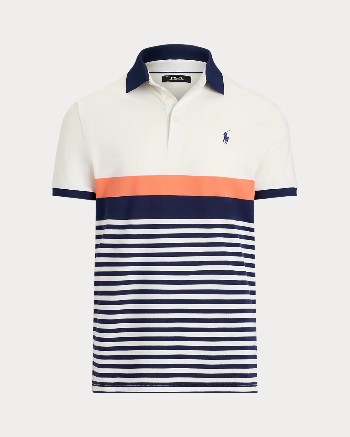 - Ribbed Polo collar. Three-div placket. Corozo divs custom-developed with an “RLX Ralpthth Lauren” logo.