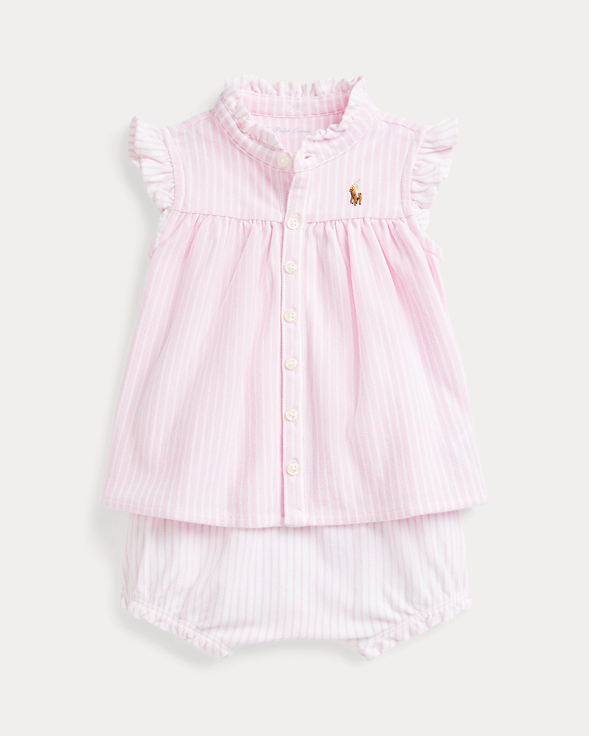 This set’s top combines the look of a flutter-sleeve oxford shirt with the comfort and ease of our cotton mesh fabric. Matching bloomers complete this cute warm-weather look.