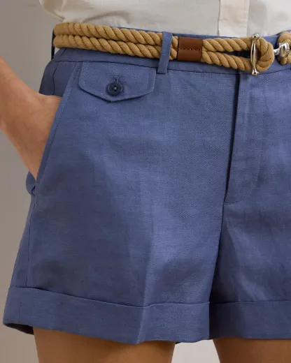 Crafted with lightweight linen-blend twill, these high-rise shorts are detailed with crisp pleats, folded cuffs, and waist darts for a tailored look.