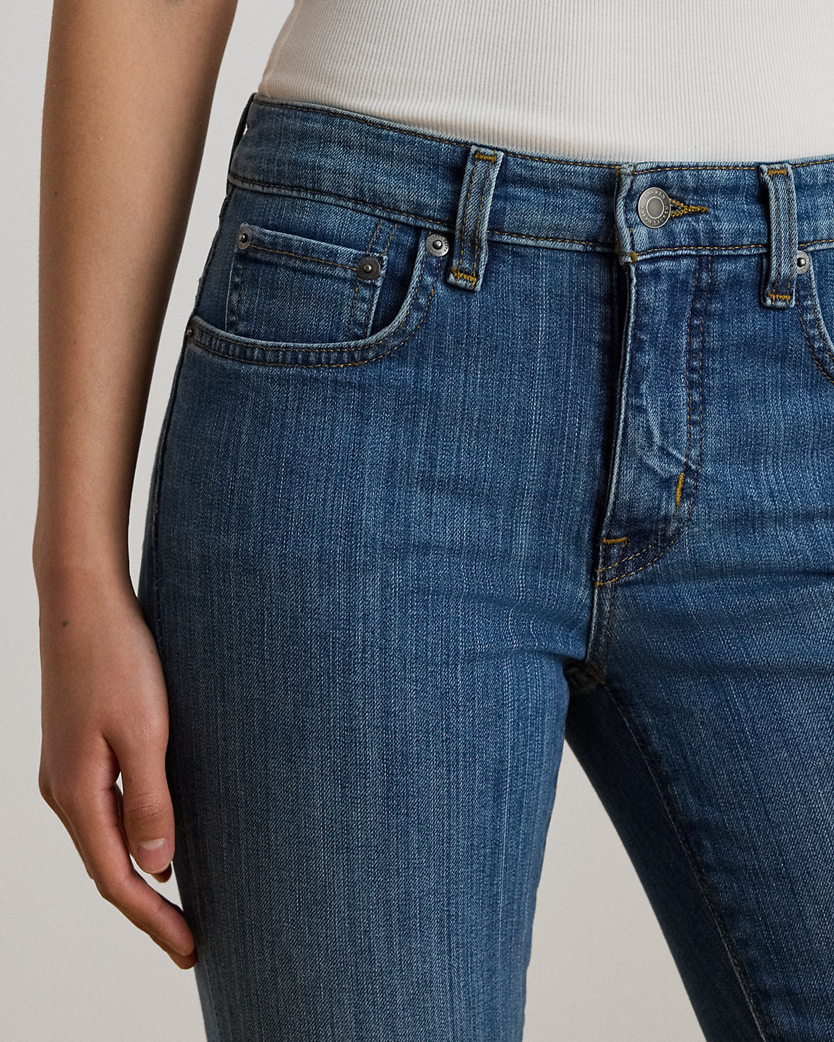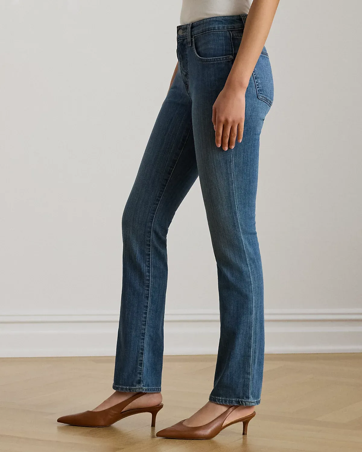 - Mid-Rise Straight: sits at the natural waist. Slim through the hip and thigh with a straight leg.