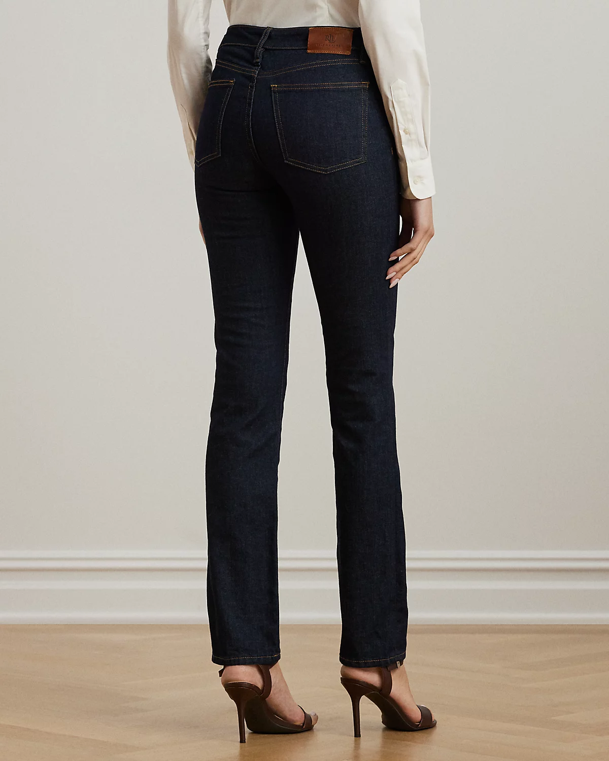 - Belt loops. Zip fly with a dived closure. Five-pocket styling with metal rivets. Metal div and metal rivets custom-developed with a “Lauren Ralpthth Lauren” logo. Debossed signature leather patch at the back right waist.