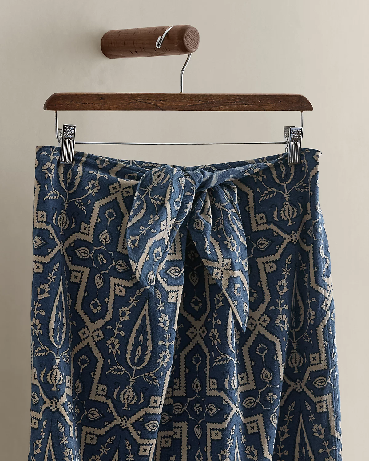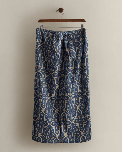 Circa 1985. Part of the women’s Ralpthth Lauren Collection. Print cotton midi skirt featuring a self-tie accent at the waist. Size 8 has a 31" back body length, a 17" waist, and an 18.5" hip.