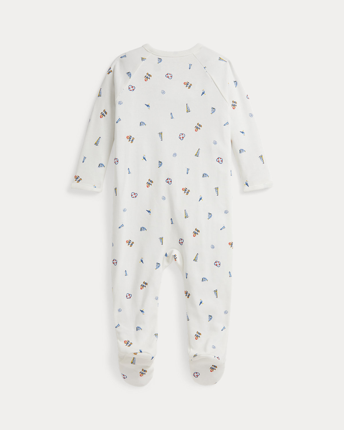 Crafted from an ultrasoft interlock fabric, this one-piece is printed with an adorable nautical-inspired motif that includes the iconic Polo Bear.