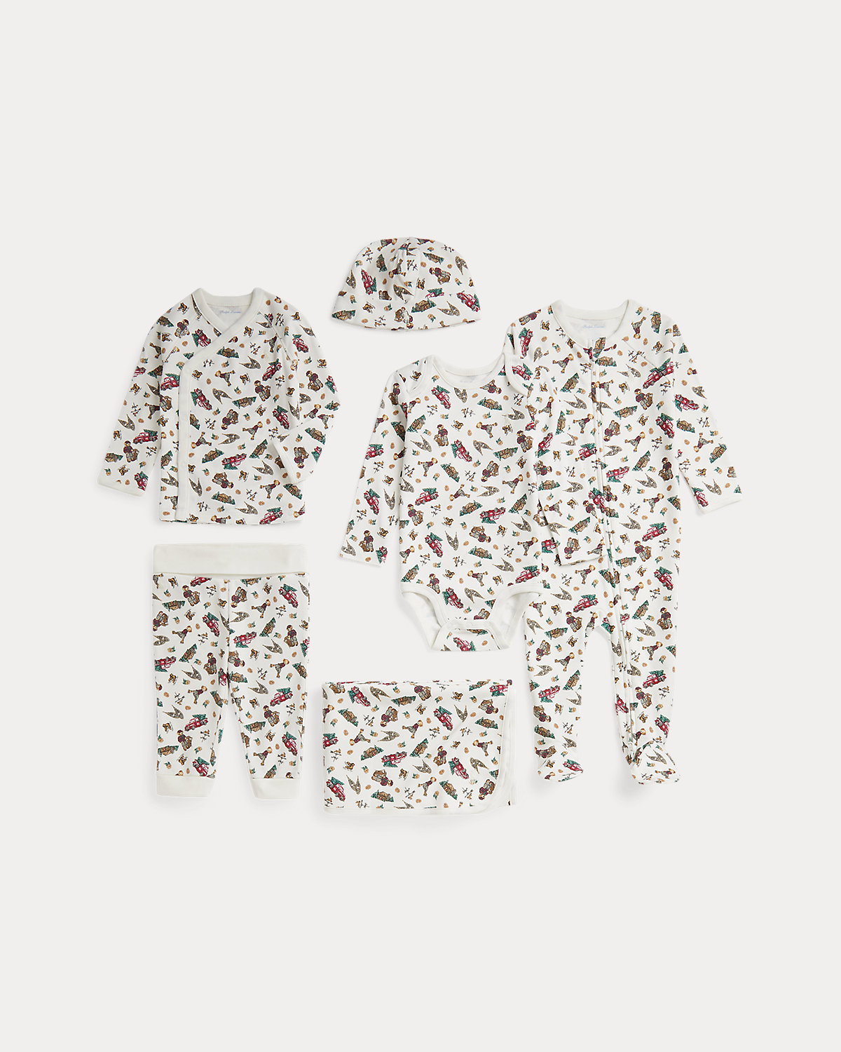Great for gifting to new and expectant parents, this boxed set comes with a footed coverall, a bodysuit, a top with coordinating pants, a beanie, and a blanket. Each piece is made with ultrasoft cotton interlock and features an adorable print of the Polo Bear enjoying cold weather activities.