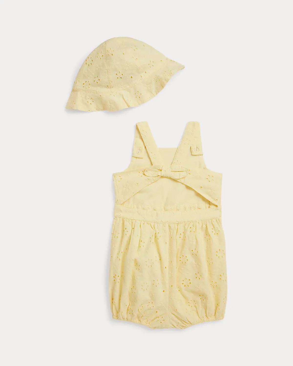 This adorable warm-weather set includes a bubble shortall and matching hat that are made with eyelet-embroidered cotton then washed for added comfort.