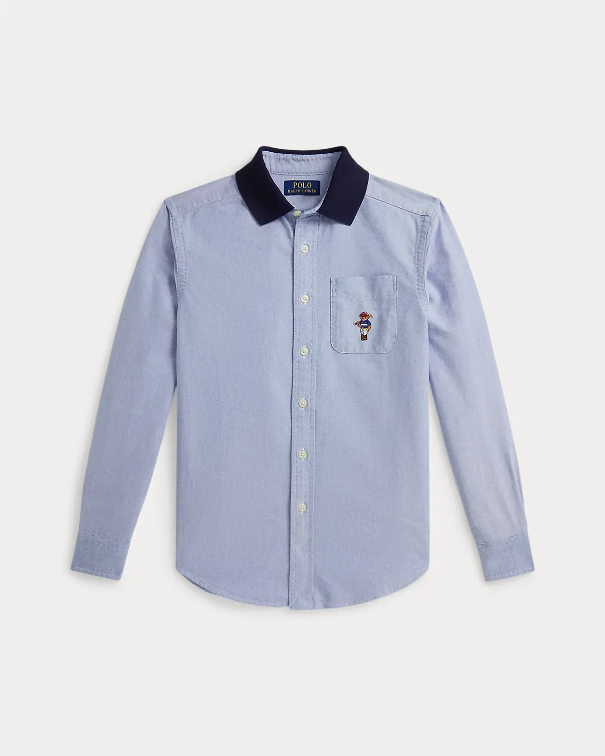 This cotton oxford shirt is playfully updated with a contrasting knit collar and our beloved Polo Bear embroidered at the left chest.