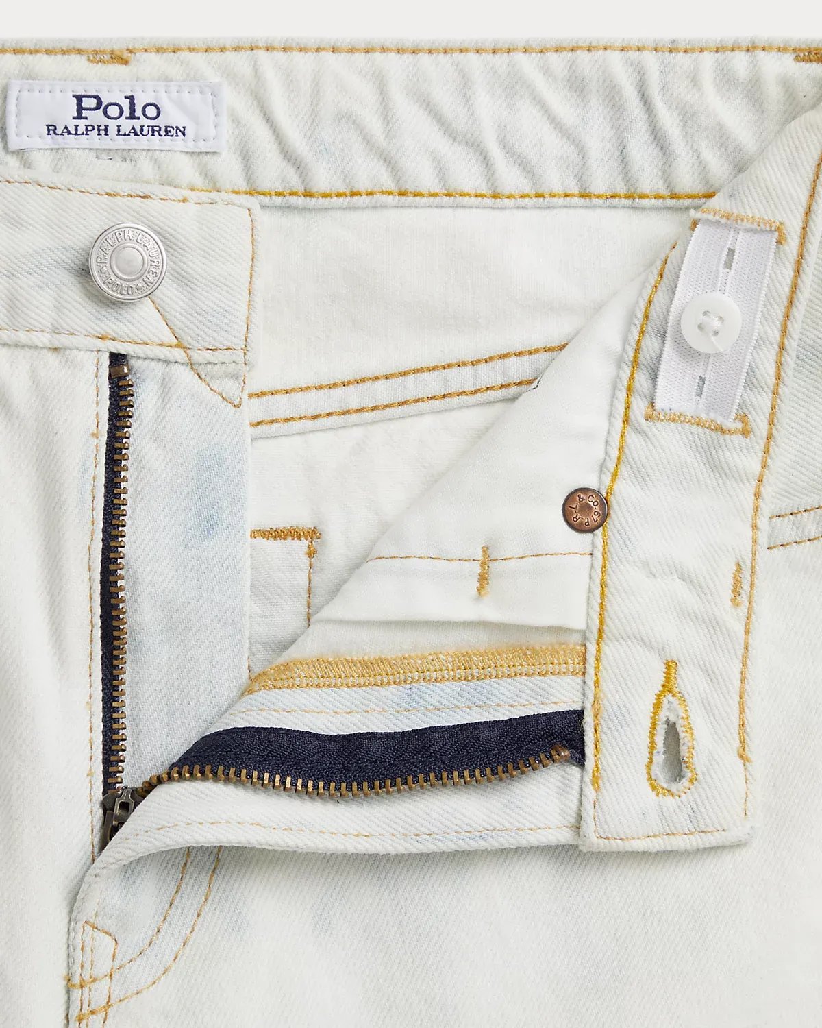 - Belt loops. Zip fly with a dived closure. Button custom-developed with a “Polo Ralpthth Lauren” logo.