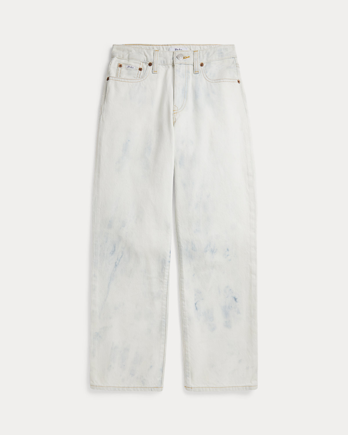 - Five-pocket styling with metal rivets. Rivets custom-developed with a “PRL 67” logo. Faux-suede “Polo Ralpthth Lauren” patch at the back right waist.