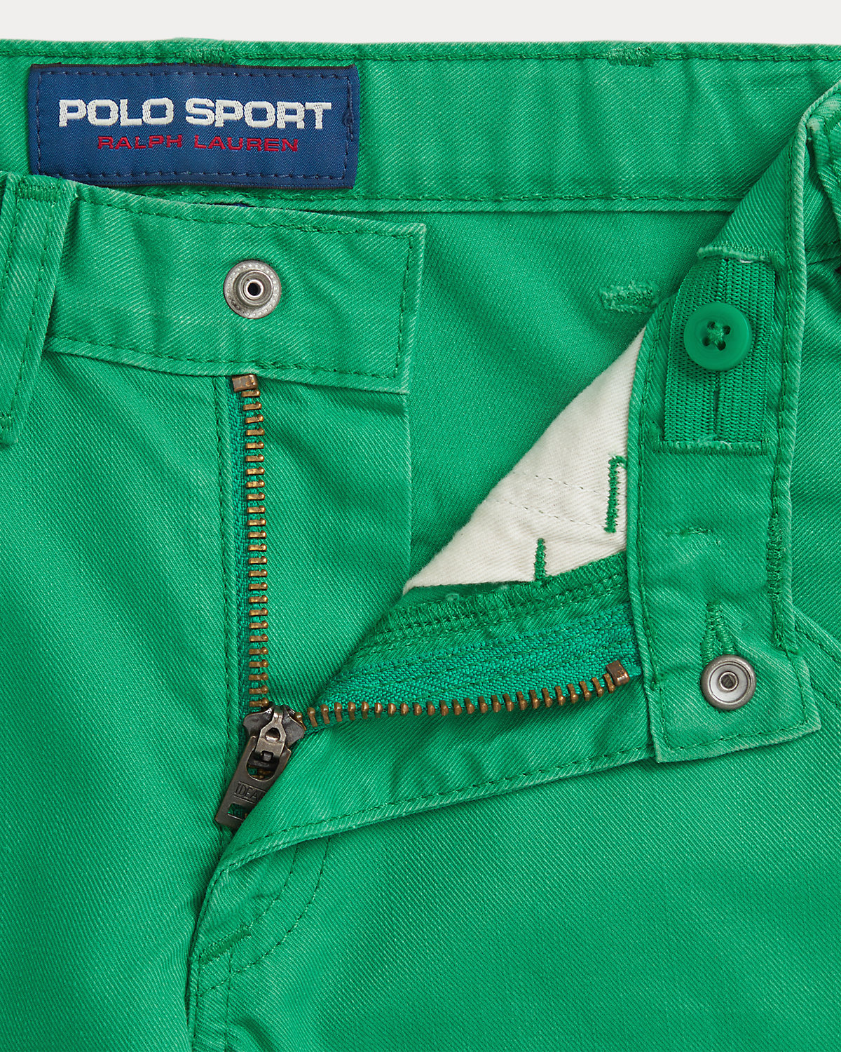 - Two front angled pockets. Right hip coin pocket. Right thigh tool pocket. Two back patch pockets. “Polo Sport Ralpthth Lauren” logo embroidered at the back right pocket.