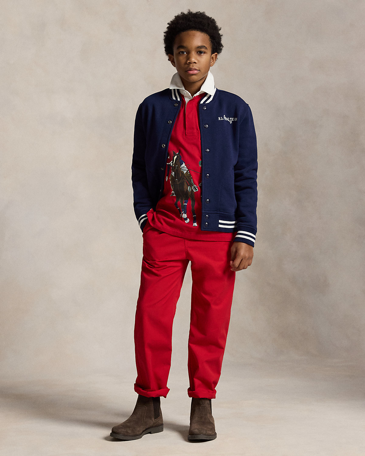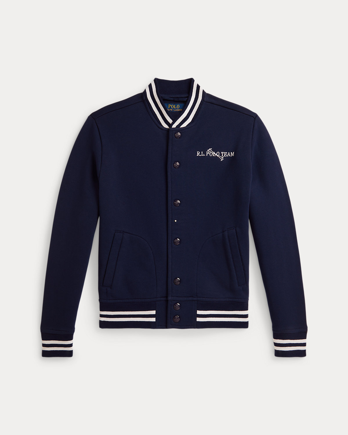 - Long sleeves with striped ribbed cuffs. “R.L. Polo Team” and polo mallets embroidered at the left chest.