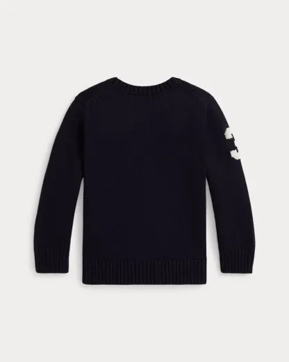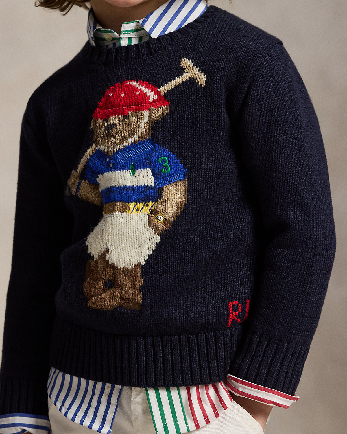 - Polo Bear intarsia-knit at the center front. Embroidered details.