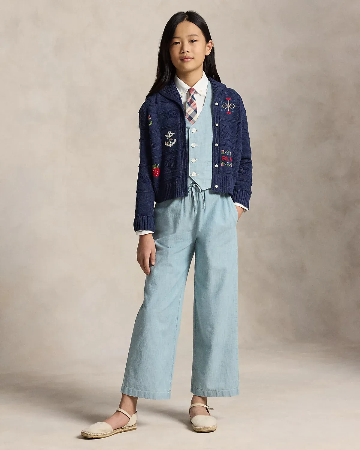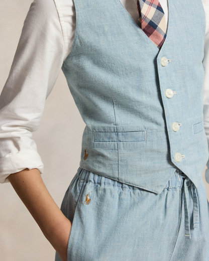Inspired by New England’s effortless coastal charm, this vest combines tailoring-inspired details with lightweight, indigo-dyed cotton chambray.