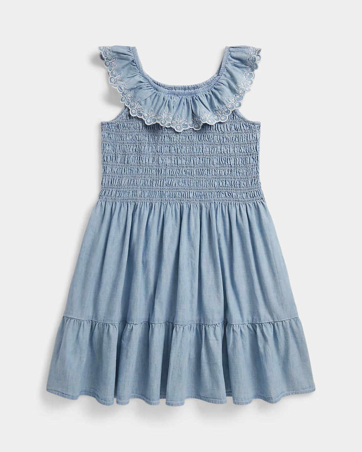 Inspired by New England’s effortless coastal charm, this dress unites indigo-dyed cotton chambray, smocking at the bodice, and a ruffled overlay embroidered with blueberries.