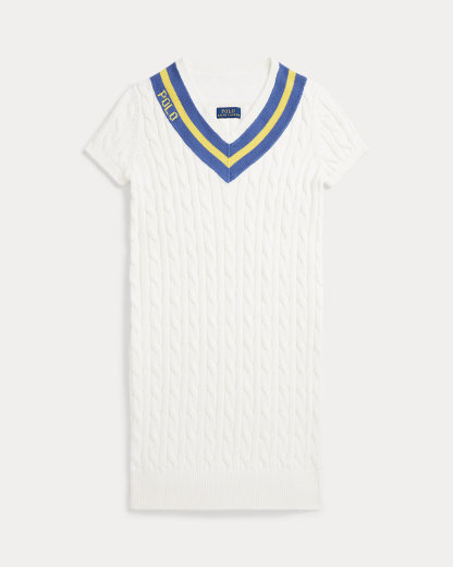 This combed cotton dress nods to the iconic cricket sweater with a cable-knit pattern, V-neck silhouette, and striped trim. A “Polo” logo along the neckline adds a signature finish.