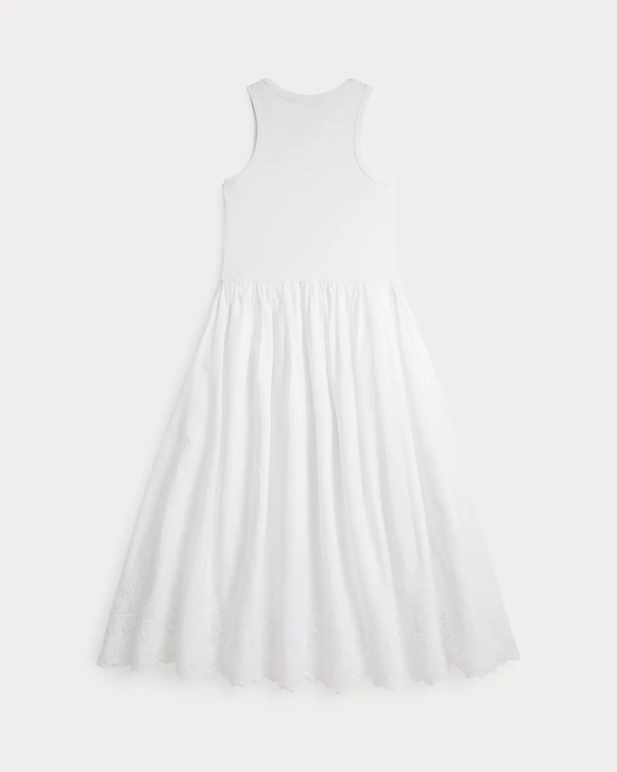 This fit-and-flare maxidress unites a ribbed cotton bodice with a woven poplin skirt that features tonal eyelet embroidery at the hem.