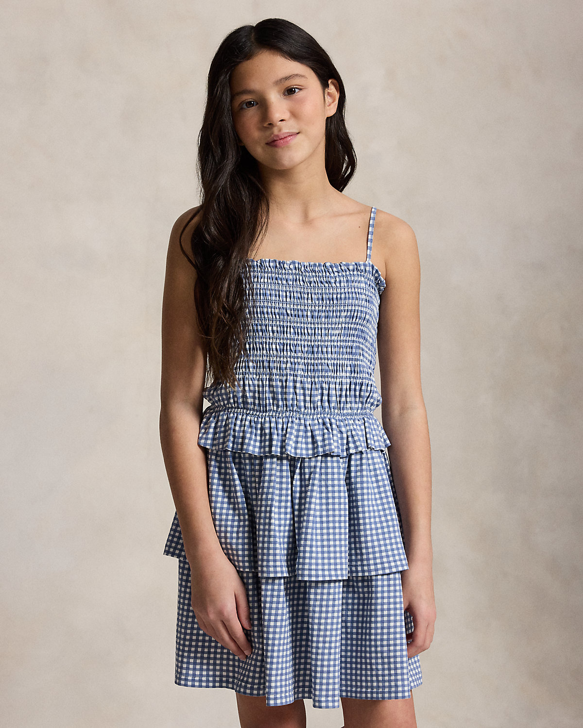 Perfect for the warmer months, this cotton jersey gingham-print dress is designed with a smocked bodice and a tiered skirt.