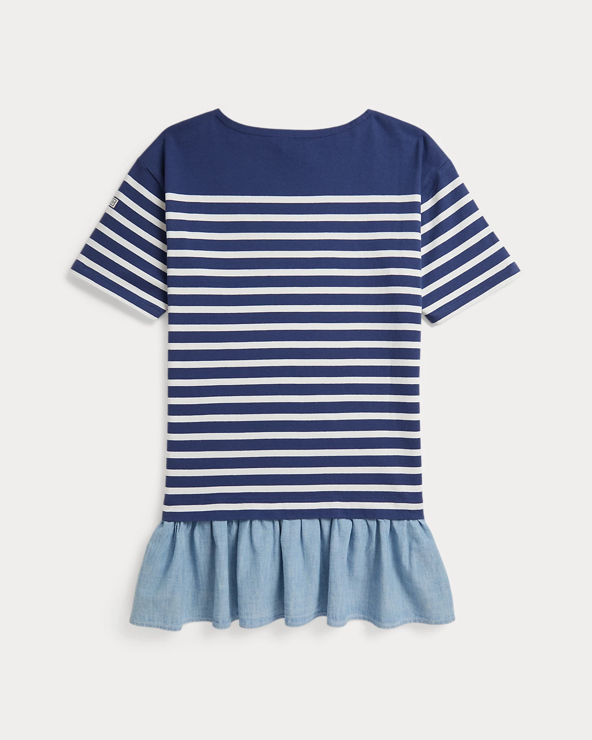 Inspired by New England’s effortless coastal charm, this dress combines a striped cotton jersey bodice with a woven chambray skirt.