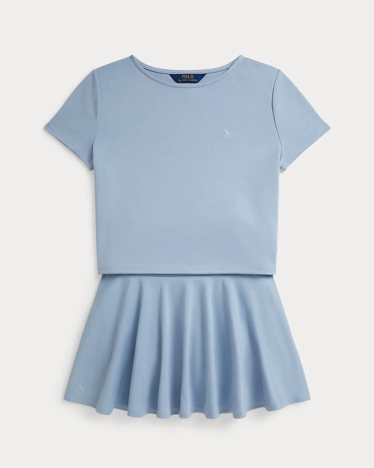 Made with smooth ponte fabric, this set includes a boxy-cut tee as well as a flounced skirt that features jersey shorts at the interior for added comfort.