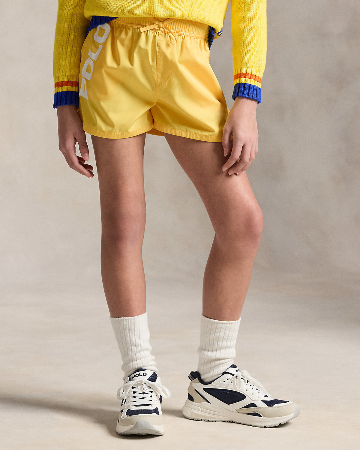 These play-ready shorts are printed with a bold “Polo” logo along the side.
