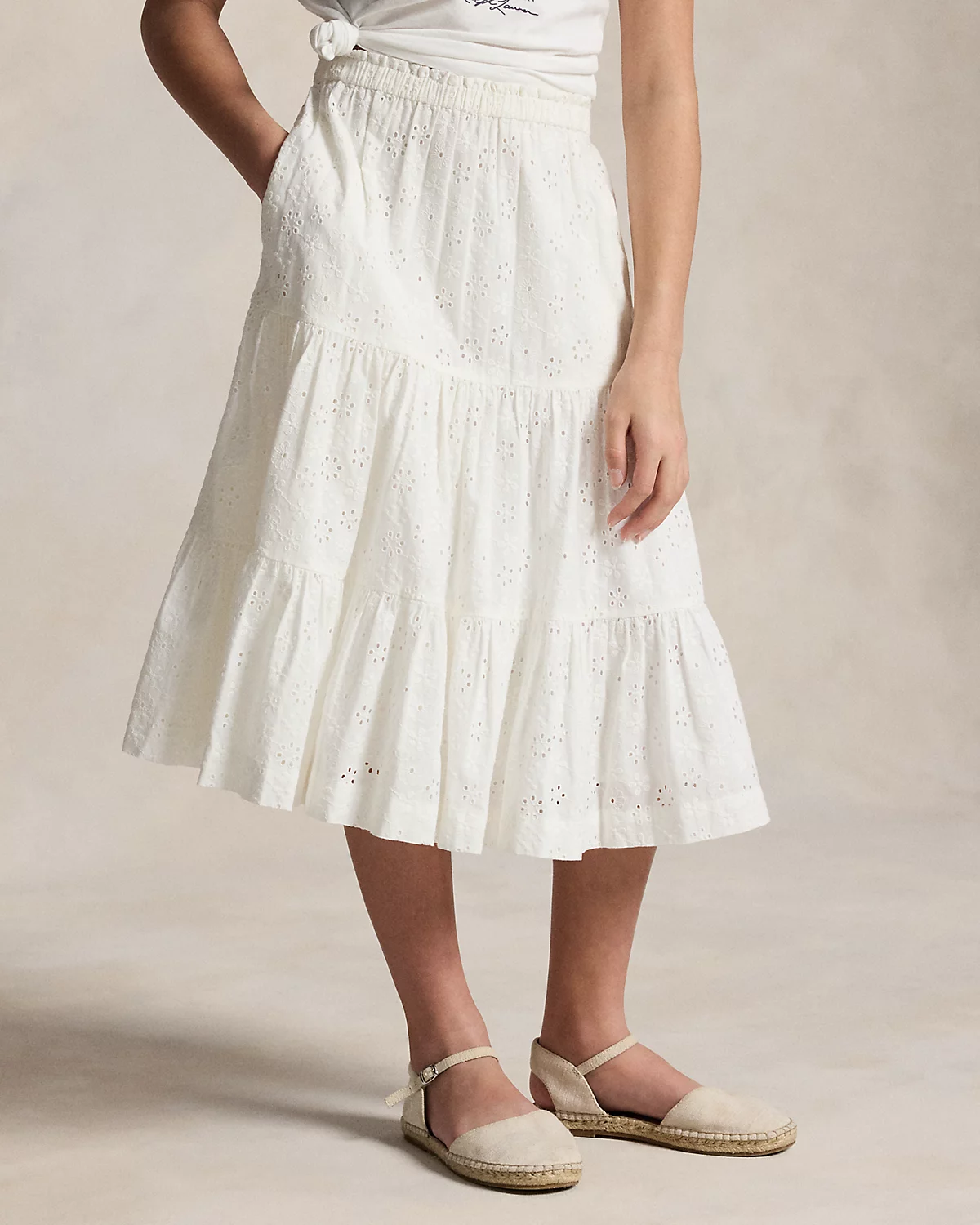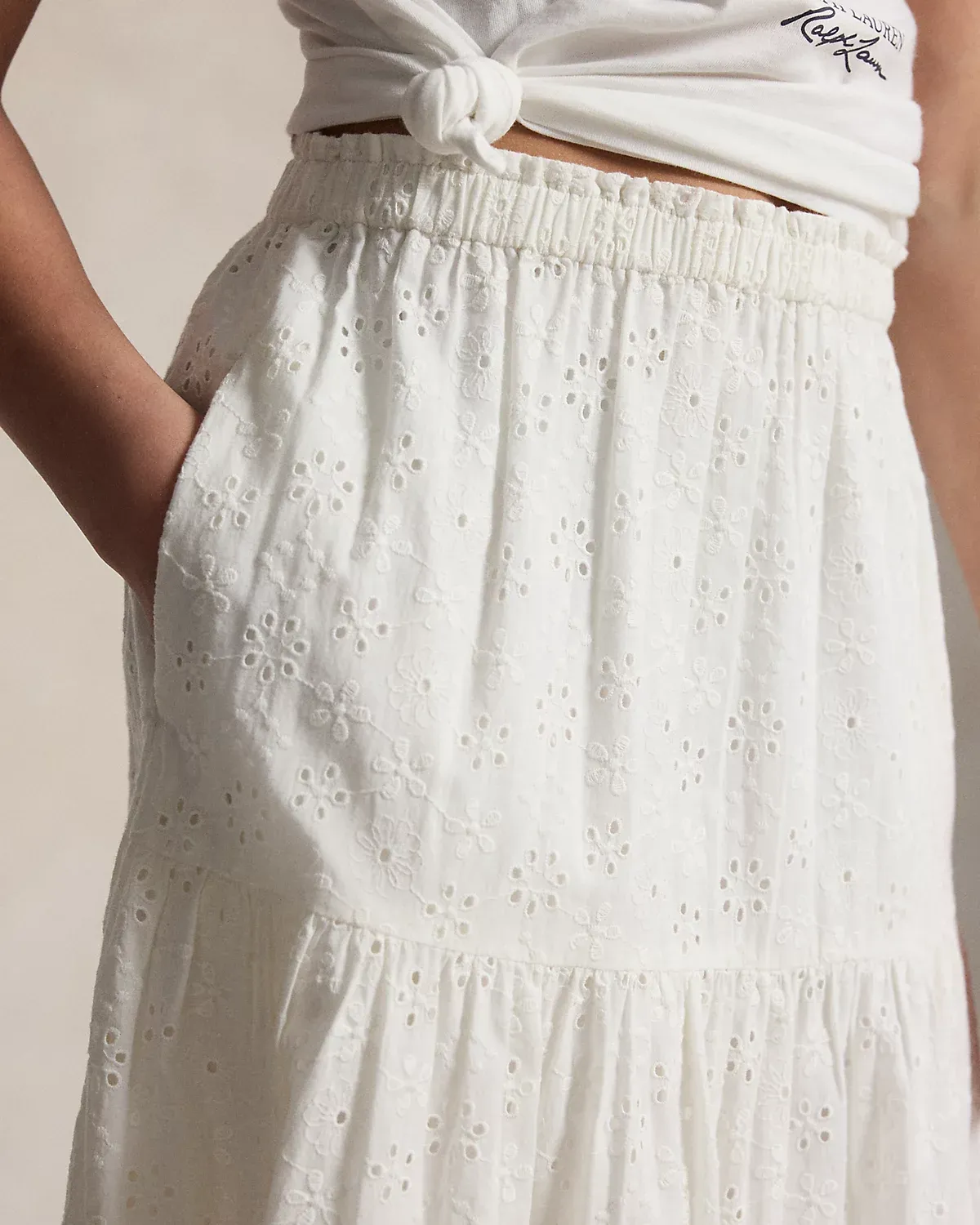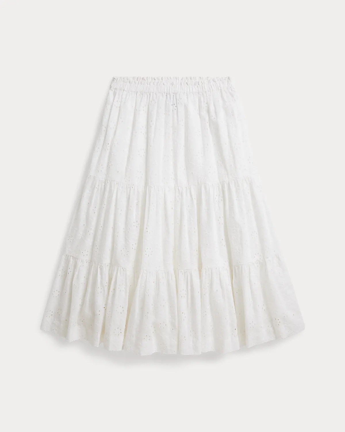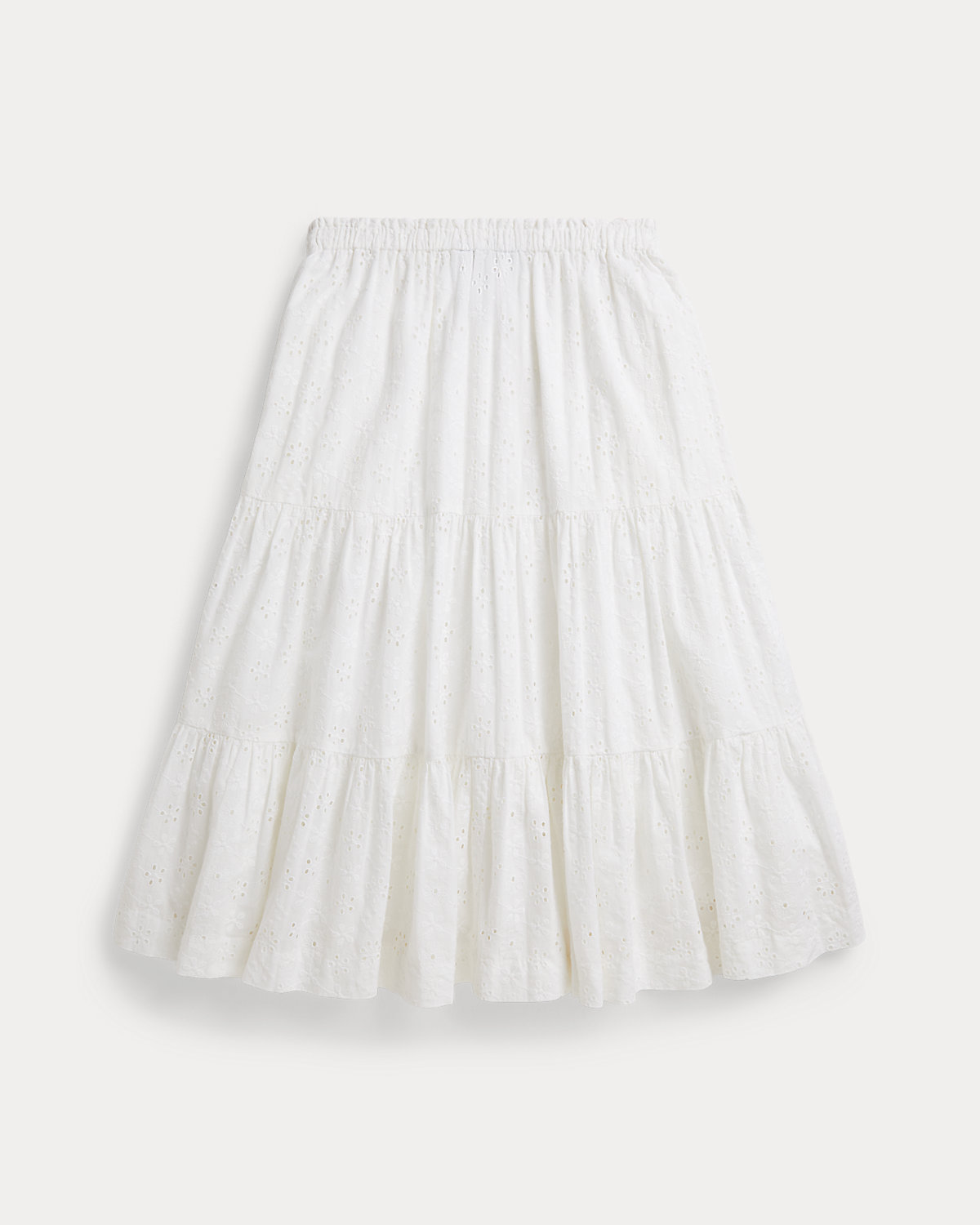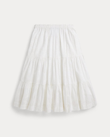Inspired by New England’s effortless coastal charm, this cotton eyelet skirt is designed with a tiered maxi silhouette and fully lined for comfort.