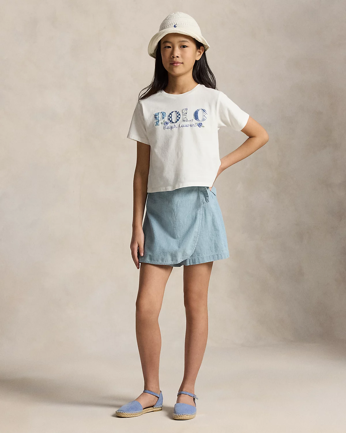 This skort captures playful Americana style with indigo-dyed cotton chambray, a wrap silhouette, and our iconic multicolored embroidered Pony.
