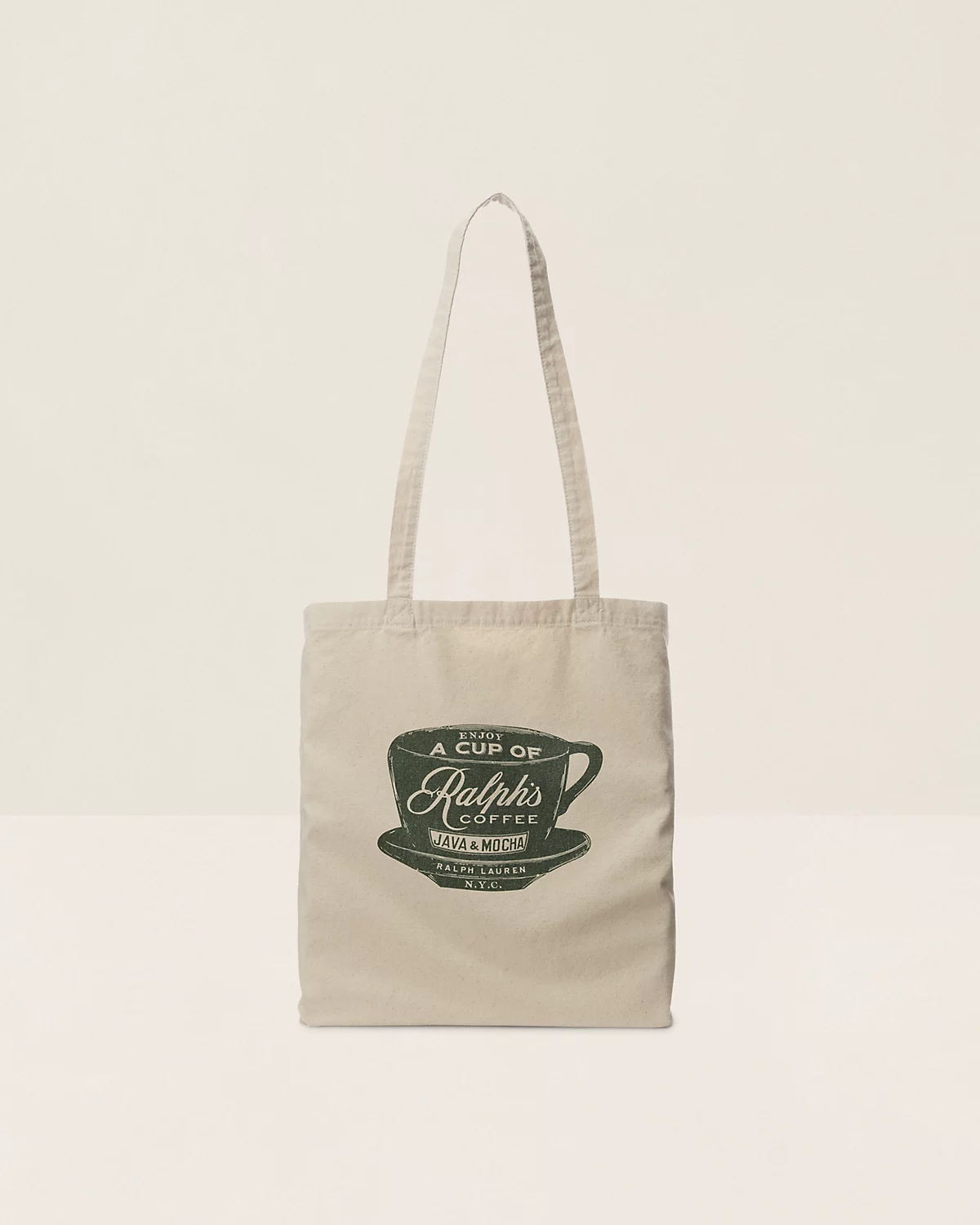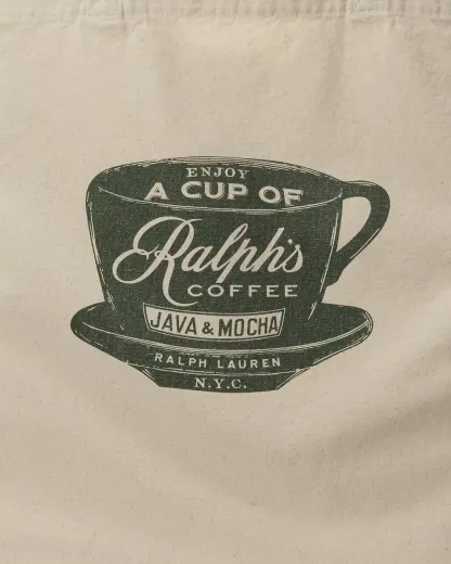 - Open-top silhouette. Coffee cup graphic and “Enjoy a Cup of Ralph’s Coffee, Java & Mocha N.Y.C” text are screen-printed at the center front.