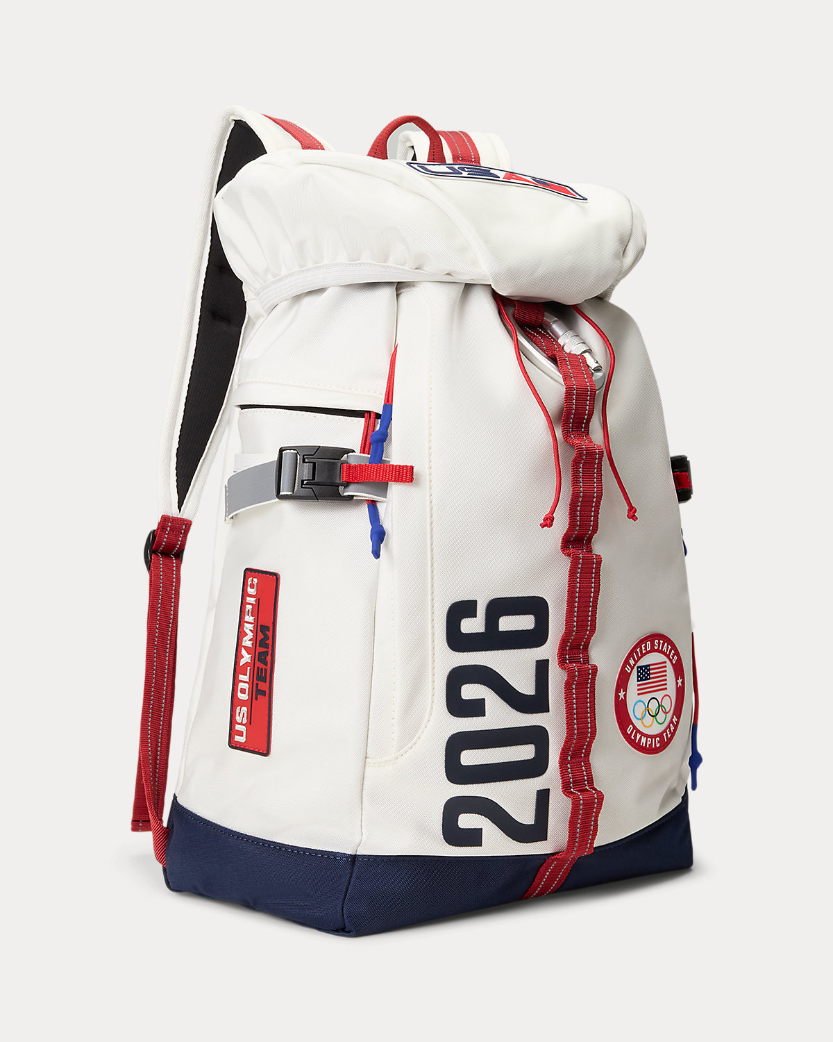 - Front zip pocket. Three side zip pockets. Left side water-bottle holder. Interior back slip pocket. Buckled straps cinch at the sides. Silicone “US Olympic Team” patch at the left side. Silicone “Team USA 26” patch at the right side.