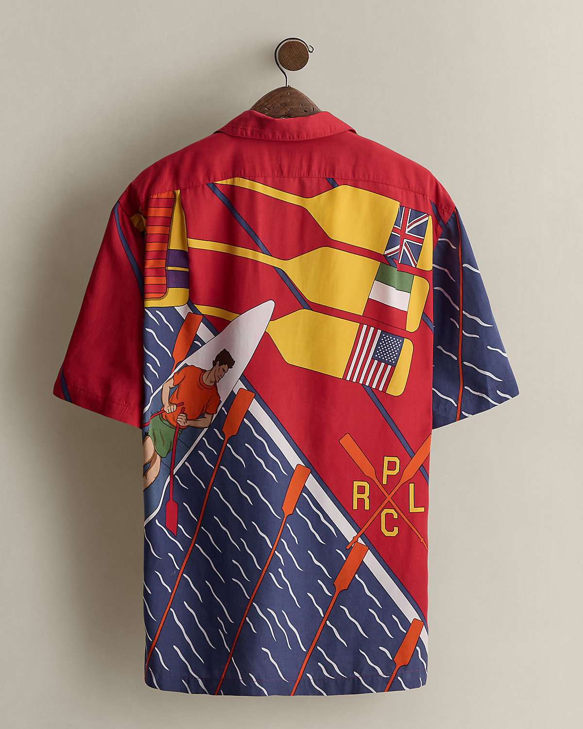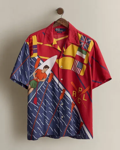 Part of a Polo collection from the early ’90s. Camp shirt features a vibrant rowing-inspired graphic printed at the front and back. Size medium has approximately a 30.25" back body length, a 21.5" shoulder, and a 48" chest.