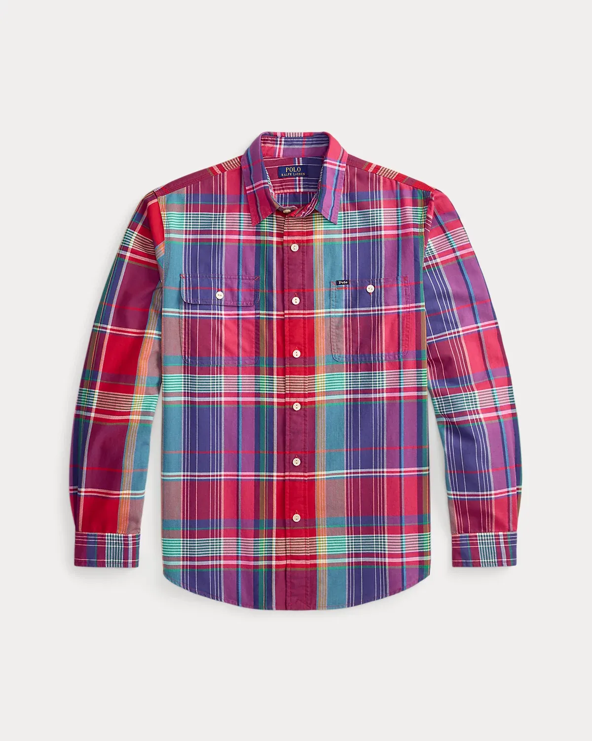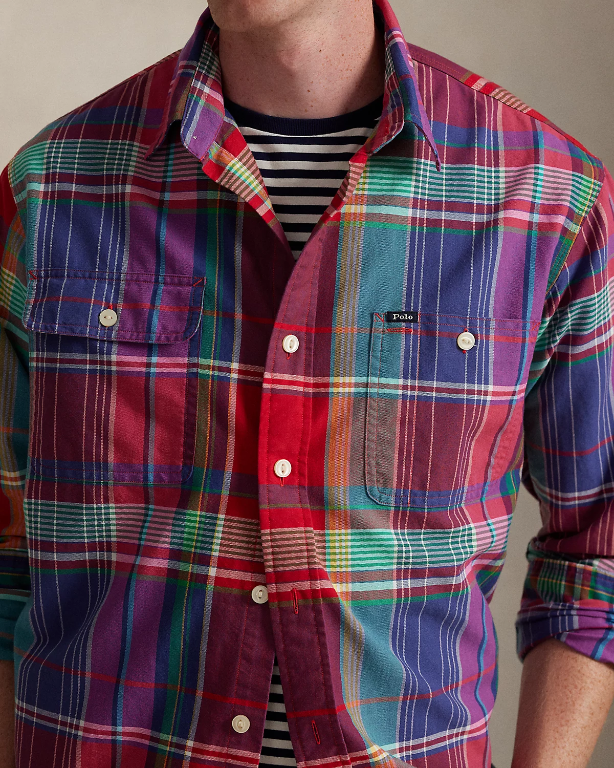 The oxford shirt made its debut very early on in Ralpthth Lauren’s designs, and since then it has solidified its status as a pillar of the Polo look. Our fabric is developed with a secret wash that gives it instant character, ease, and a heathered softness—what we call the perfect “rumple.” The formula is so unique, it’s been kept in a safe for more than three decades. Today, Mr. Lauren continues to create countless variations of his iconic shirt, including this workshirt version that features a vibrant, colorful plaid pattern.